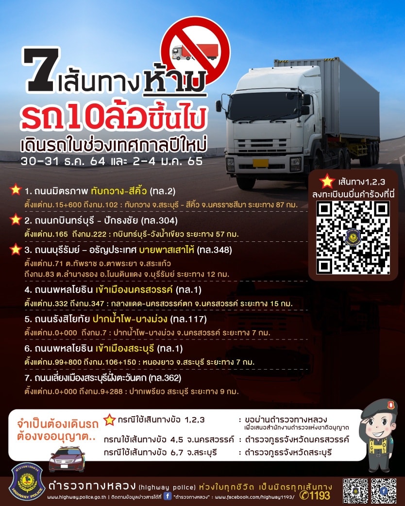 "7 เส้นทาง" ห้าม รถ 10 ล้อขึ้นไป เดินรถในช่วงเทศกาลปีใหม่ ตั้งแต่วันที่ 30-31 ธ.ค. 64 และ 2-4 ม.ค. 65