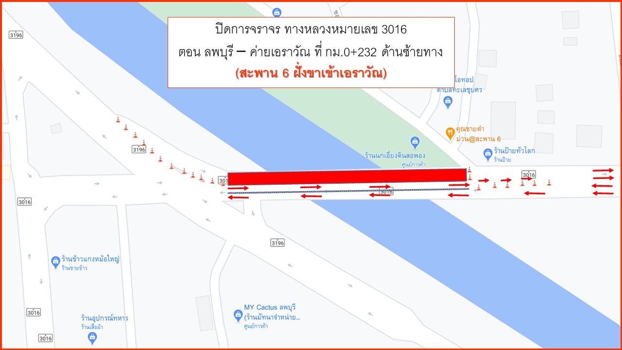 ประกาศ แขวงทางหลวงลพบุรีที่ 1 กรมทางหลวง จะทำการปิดการจราจรเพื่อซ่อมบำรุงสะพาน บนทางหลวงหมายเลข 3016 ที่ กม.0+232 (ด้านซ้ายทาง) (สะพาน 6 ฝั่งขาเข้าเอราวัณ) ระหว่างวันที่ 9 มีนาคม - 30 เมษายน 2564