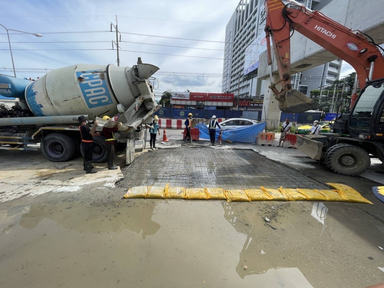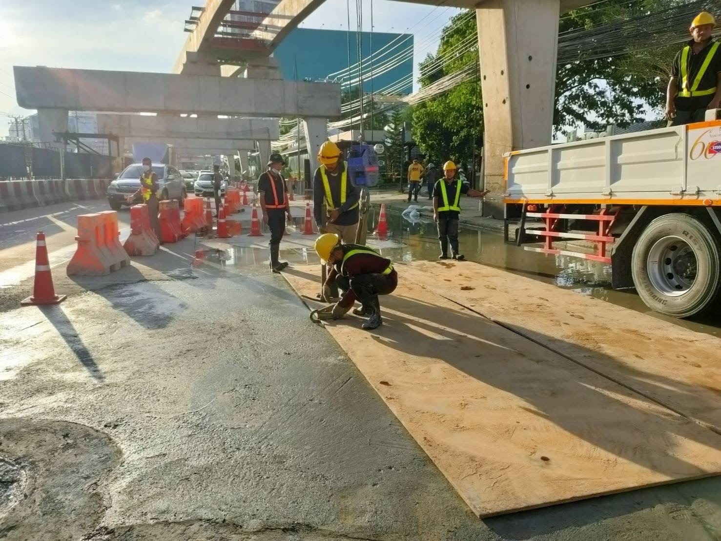 2. ดำเนินการแก้ไขเพื่อคืนพื้นผิวจราจรให้สามารถเปิดการสัญจรชั่วคราวโดยการรื้อสกัดผิวถนนที่ทรุดตัว หาโพรงที่มีการรั่วซึมและนำทรายหยาบลง พร้อมเทคอนกรีต high strength fast setting แล้วปูแผ่นเหล็กทับชั่วคราว ซึ่งคาดว่าจะแล้วเสร็จและเปิดการจราจรตามปกติได้ในเวลาประมาณ 18.30 น. ของวันนี้ (11 กันยายน 2565) เพื่ออำนวยความสะดวกในการเดินทางให้กับประชาชน