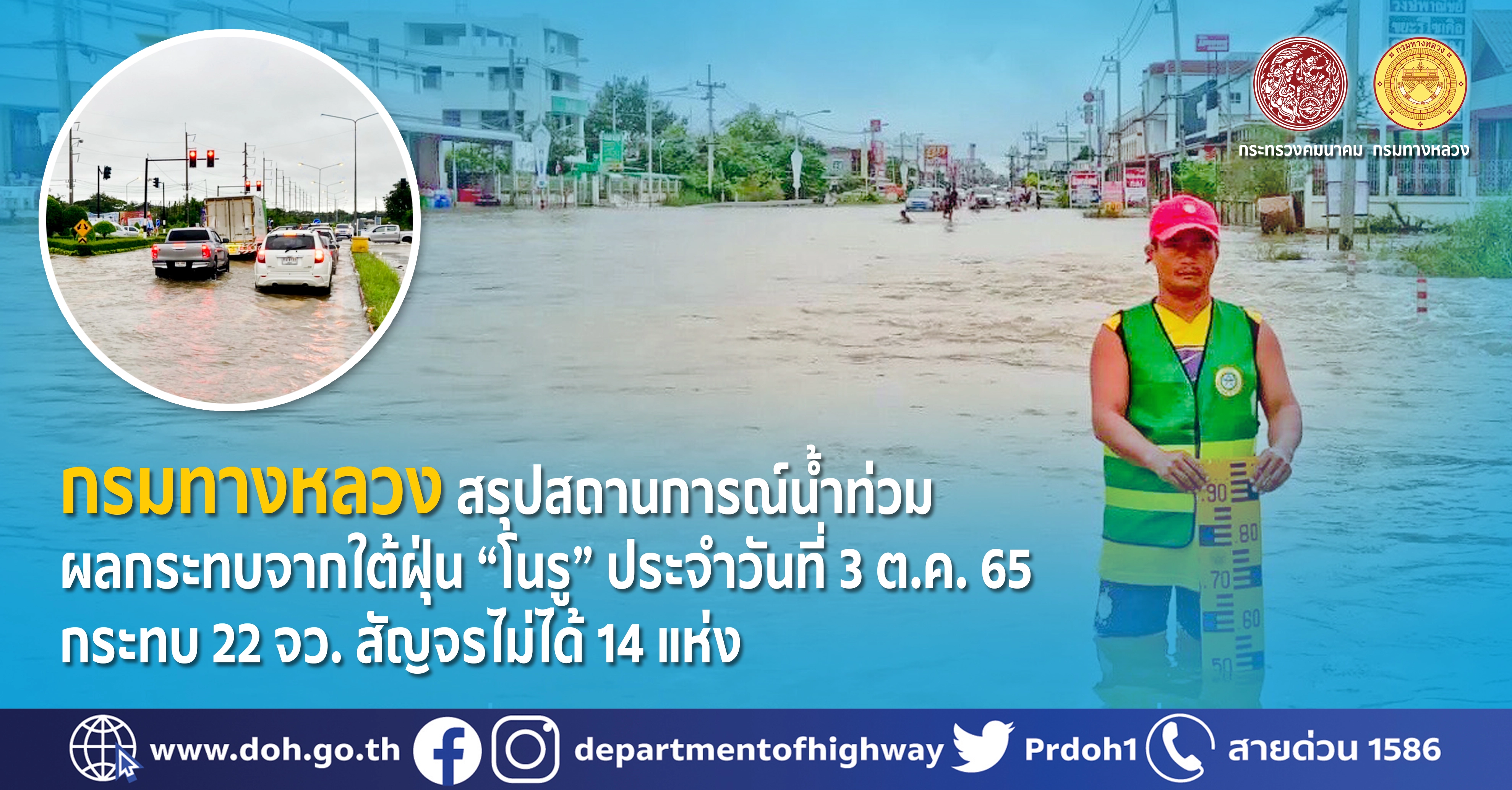 กรมทางหลวง ได้ทำการสรุปสถานการณ์อุทกภัยและดินสไลด์บนทางหลวง ผลกระทบจากพายุไต้ฝุ่นโนรู สถานการณ์ประจำวันที่ 3 ตุลาคม 2565 เวลา 15.00 น. พบทางหลวงถูกน้ำท่วม/ดินสไลด์ในพื้นที่ 22 จังหวัด ได้แก่ จ.เพชรบูรณ์, จ.เลย, จ.ศรีสะเกษ, จ.สุรินทร์, จ.บุรีรัมย์, จ.นครราชสีมา, จ.ขอนแก่น, จ.มหาสารคาม, จ.ชัยภูมิ, จ.อุบลราชธานี, จ.หนองบัวลำภู, จ.ร้อยเอ็ด, จ.ลพบุรี, จ.อ่างทอง, จ.พระนครศรีอยุธยา, จ.สุโขทัย, จ.กำแพงเพชร, จ.ชัยนาท, จ.ปราจีนบุรี, จ.ลำพูน, จ.เชียงใหม่ และ จ.นครสวรรค์ จำนวน 72 สายทาง จำนวน 97 แห่ง ทางหลวงที่การจราจรผ่านได้ 84 แห่ง การจราจรผ่านไม่ได้ 14 แห่ง โดยทุกจุดมีเจ้าหน้าที่คอยอำนวยความสะดวกด้านการจราจร รายละเอียดดังนี้