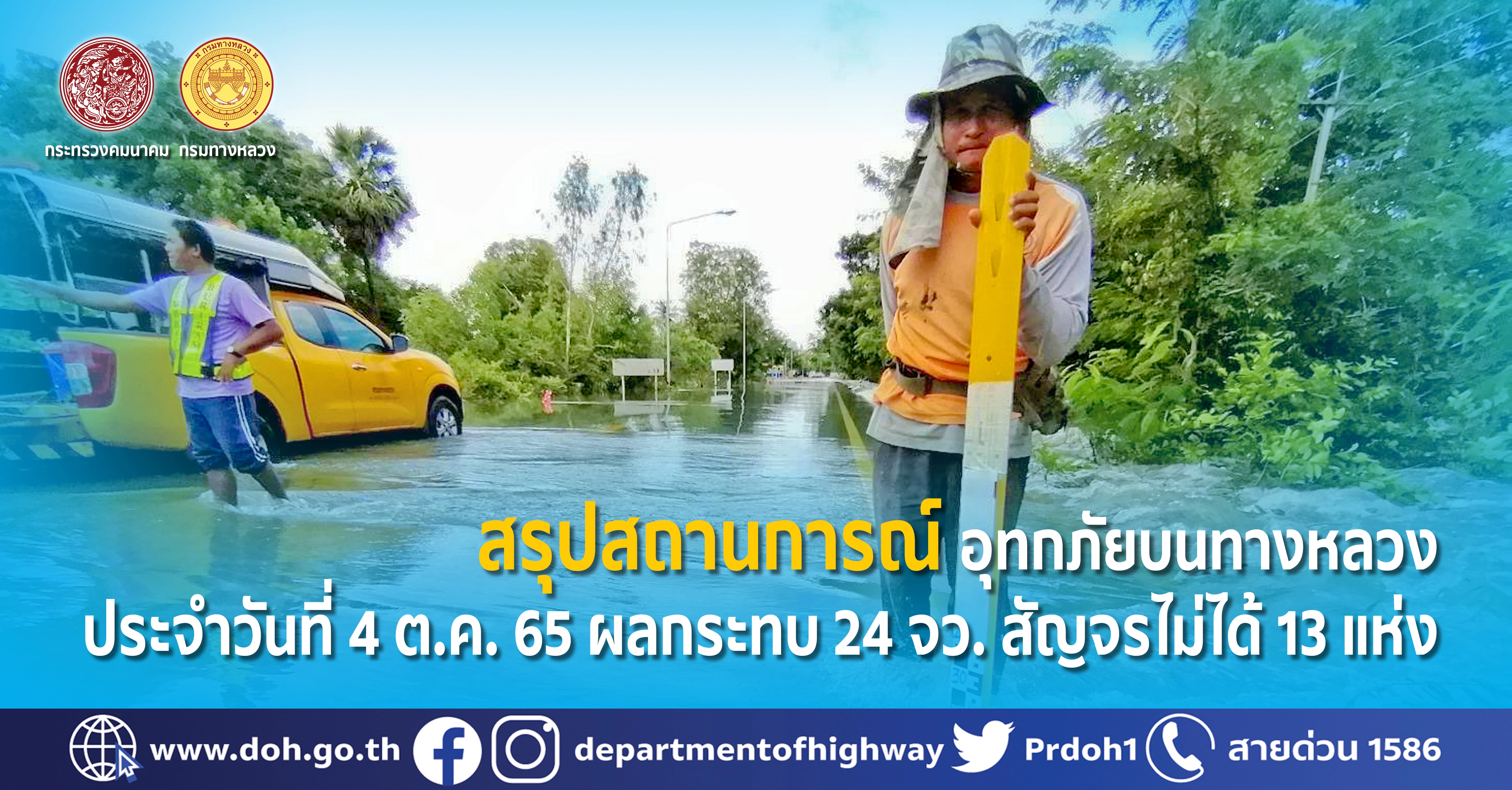 นายสราวุธ ทรงศิวิไล อธิบดีกรมทางหลวง เปิดเผยว่า กรมทางหลวง ได้ขานรับข้อสั่งการของ นายศักดิ์สยาม ชิดชอบ รมว.คมนาคม ที่ให้หน่วยงานที่เกี่ยวข้อง ลงพื้นที่ เพื่ออำนวยความสะดวกปลอดภัยให้กับประชาชนจากสถานการณ์ฝนตกหนักในหลายพื้นที่ จากผลกระทบจากพายุไต้ฝุ่น “โนรู” พร้อมทั้งเฝ้าระวังตลอด 24 ชั่วโมง เพื่อช่วยประชาชนที่ได้รับผลกระทบอย่างทันท่วงที กรมทางหลวง ได้ทำการสรุปสถานการณ์อุทกภัยและดินสไลด์บนทางหลวง โดยสถานการณ์ประจำวันที่ 4 ตุลาคม 2565 เวลา 12.30 น. พบทางหลวงถูกน้ำท่วม/ดินสไลด์ในพื้นที่ 24 จังหวัด ได้แก่ จ.เพชรบูรณ์, จ.เลย, จ.ศรีสะเกษ, จ.สุรินทร์, จ.บุรีรัมย์, จ.นครราชสีมา, จ.ขอนแก่น, จ.มหาสารคาม, จ.ชัยภูมิ, จ.อุบลราชธานี, จ.หนองบัวลำภู, จ.ร้อยเอ็ด, จ.ลพบุรี, จ.อ่างทอง, จ.พระนครศรีอยุธยา, จ.กำแพงเพชร, จ.กรุงเทพฯ, จ.นนทบุรี, จ.สระบุรี, จ.ลำปาง, จ.ปราจีนบุรี, จ.เชียงใหม่, จ.นครสวรรค์ และ จ.ตาก จำนวน 76 สายทาง จำนวน 104 แห่ง ทางหลวงที่การจราจรผ่านได้ 91 แห่ง การจราจรผ่านไม่ได้ 13 แห่ง ในพื้นที่ 7 จังหวัด โดยทุกจุดมีเจ้าหน้าที่คอยอำนวยความสะดวกด้านการจราจร รายละเอียดดังนี้
