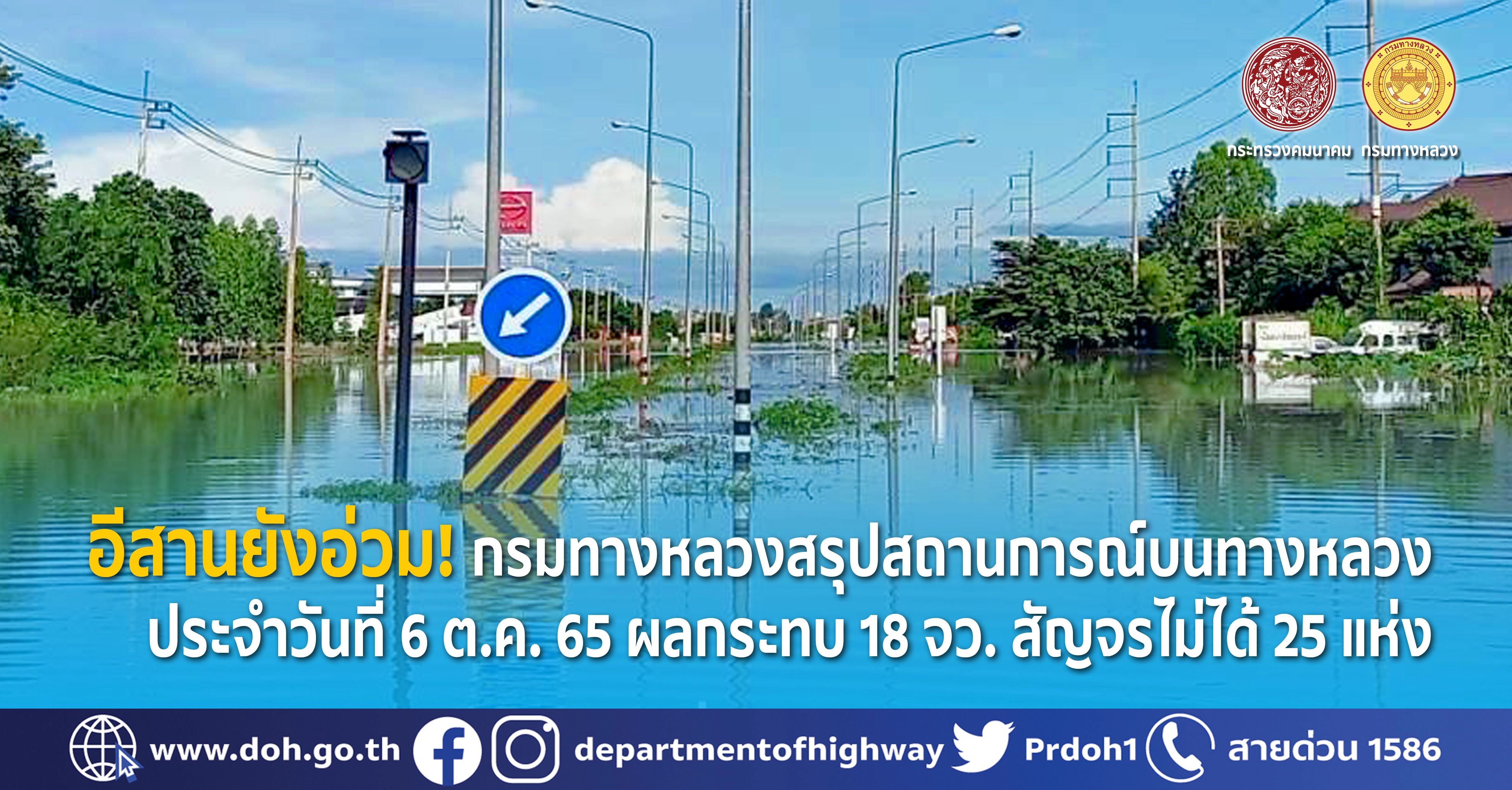 กรมทางหลวงร่วมบูรณาการกับหน่วยงานที่เกี่ยวข้องในการลงพื้นที่ เพื่อช่วยเหลือประชาชน พร้อมเร่งระบายน้ำบำรุงรักษาเส้นทางที่ได้รับผลกระทบ ในขณะที่บางพื้นที่ก็มีการล้างทำความสะอาดถนน ทางลอดใต้สะพานหลังจากน้ำลดลงบ้างแล้ว เพื่อบรรเทาความเดือดร้อนของประชาชนให้ได้รับความสะดวกปลอดภัยในการสัญจรโดยเร็วที่สุดอย่างต่อเนื่อง 24 ชั่วโมง ตามข้อสั่งการของ นายศักดิ์สยาม ชิดชอบ รมว.คมนาคม ที่มีความห่วงใย จากสถานการณ์ฝนตกหนักในหลายพื้นที่ ที่ได้รับผลกระทบจากพายุไต้ฝุ่น “โนรู” พร้อมทั้งเฝ้าระวังตลอด 24 ชั่วโมง เพื่อช่วยประชาชนอย่างทันท่วงที พร้อมกันนี้กรมทางหลวง ได้ทำการสรุปสถานการณ์อุทกภัยและดินสไลด์บนทางหลวง โดยสถานการณ์ประจำวันที่ 6 ตุลาคม 2565 เวลา 15.00 น. พบทางหลวงถูกน้ำท่วม/ดินสไลด์ในพื้นที่ 18 จังหวัด ได้แก่ จ.เลย, จ.ศรีสะเกษ, จ.สุรินทร์, จ.บุรีรัมย์, จ.นครราชสีมา, จ.ขอนแก่น, จ.มหาสารคาม, จ.ชัยภูมิ, จ.อุบลราชธานี, จ.หนองบัวลำภู, จ.ร้อยเอ็ด, จ.ลพบุรี, จ.อ่างทอง, จ.พระนครศรีอยุธยา, จ.สิงห์บุรี, จ.ปราจีนบุรี, จ.นครสวรรค์ และ จ.เชียงใหม่ จำนวน 53 สายทาง จำนวน 71 แห่ง ทางหลวงที่การจราจรผ่านได้ 46 แห่ง การจราจรผ่านไม่ได้ 25 แห่ง ในพื้นที่ 9 จังหวัด โดยทุกจุดมีเจ้าหน้าที่คอยอำนวยความสะดวกด้านการจราจร รายละเอียดดังนี้