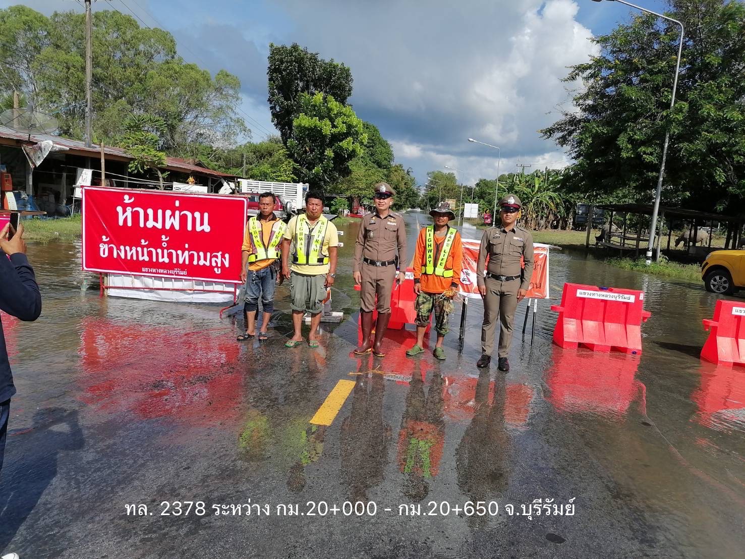 - บนทางหลวงหมายเลข 2065 ตอน พล – ลำชี ในพื้นที่ อ.พล ช่วง กม.ที่ 33+150 – 34+000 ระดับน้ำ 50 ซม. ให้ใช้เส้นทางเลี่ยงท้องถิ่นแทน