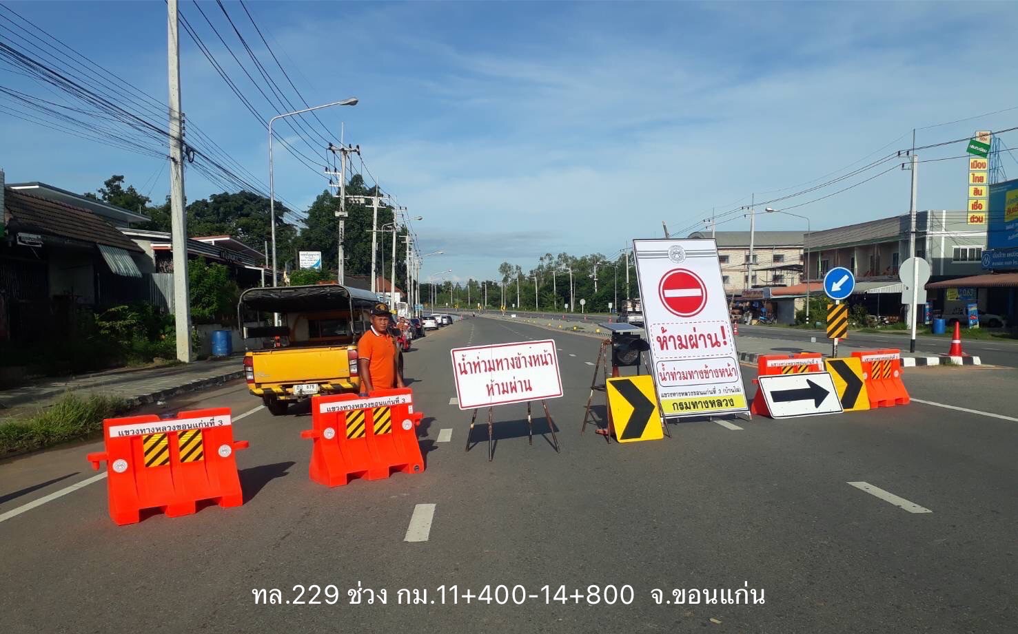 - บนทางหลวงหมายเลข 2183 ตอน น้ำพอง – โคกท่า ในพื้นที่ อ.น้ำพอง ช่วง กม.ที่ 14+500 – 15+100 ระดับน้ำ 40 - 45 ซม. ให้ใช้เส้นทางเลี่ยงแยกโคกท่า กม.25+600
