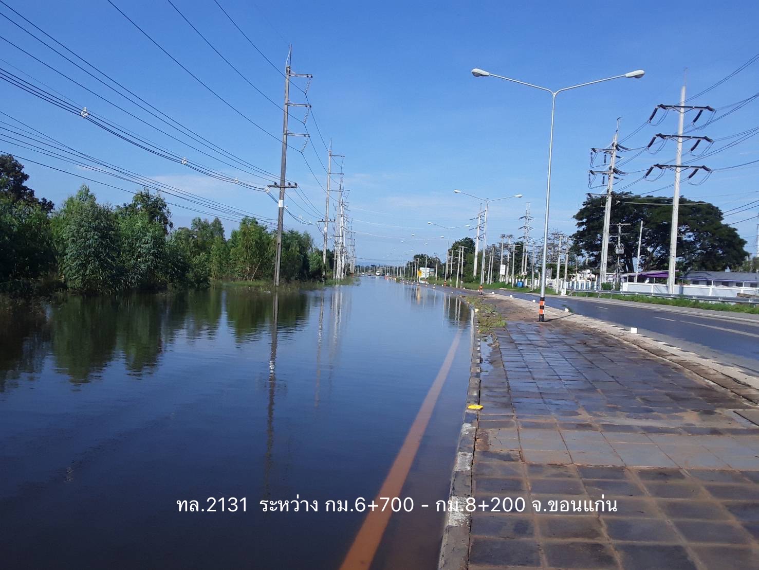 - ทางหลวงหมายเลข 2183 น้ำพอง – โคกท่า ในพื้นที่ อ.น้ำพอง ช่วง กม.ที่ 14+500 – 15+100 ระดับน้ำ 40 - 45 ซม. การจราจรไม่สามารถผ่านได้ ให้ใช้เส้นทางเลี่ยงแยกโคกท่า กม.25+600