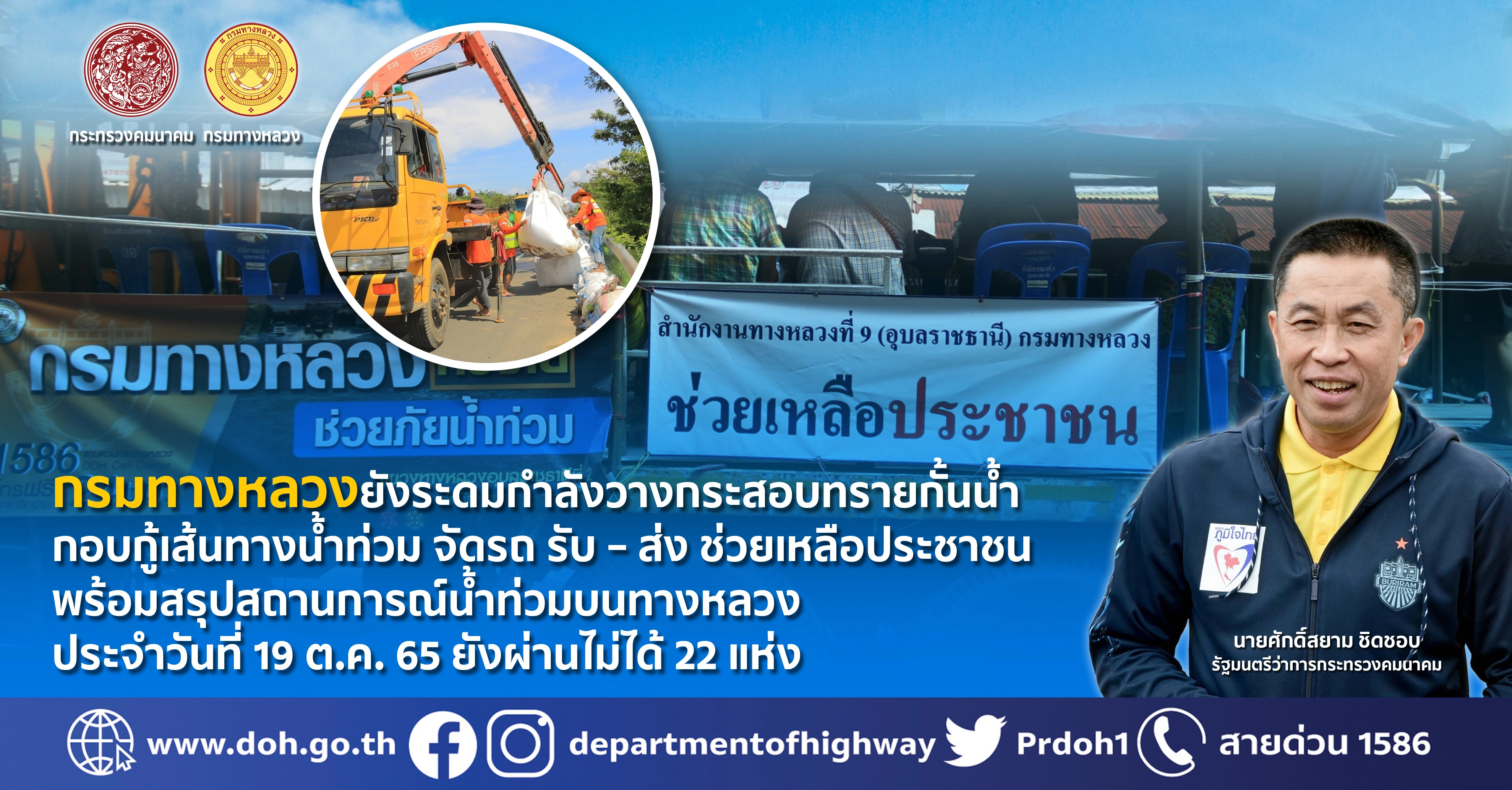 พร้อมกันนี้กรมทางหลวง ได้ทำการสรุปสถานการณ์อุทกภัยและดินสไลด์บนทางหลวง โดย สถานการณ์ประจำวันที่ 19 ตุลาคม 2565 เวลา 12.30 น. พบทางหลวงถูกน้ำท่วม/ดินสไลด์ ในพื้นที่ 8 จังหวัด ได้แก่ จ.ขอนแก่น, จ.ศรีสะเกษ, จ.หนองบัวลำภู , จ.อุบลราชธานี, จ.มหาสารคาม, จ.อ่างทอง, จ.พระนครศรีอยุธยา และ จ.สิงห์บุรี จำนวน 21 สายทาง 29 แห่ง การจราจรผ่านไม่ได้ 22 แห่ง ดังนี้
