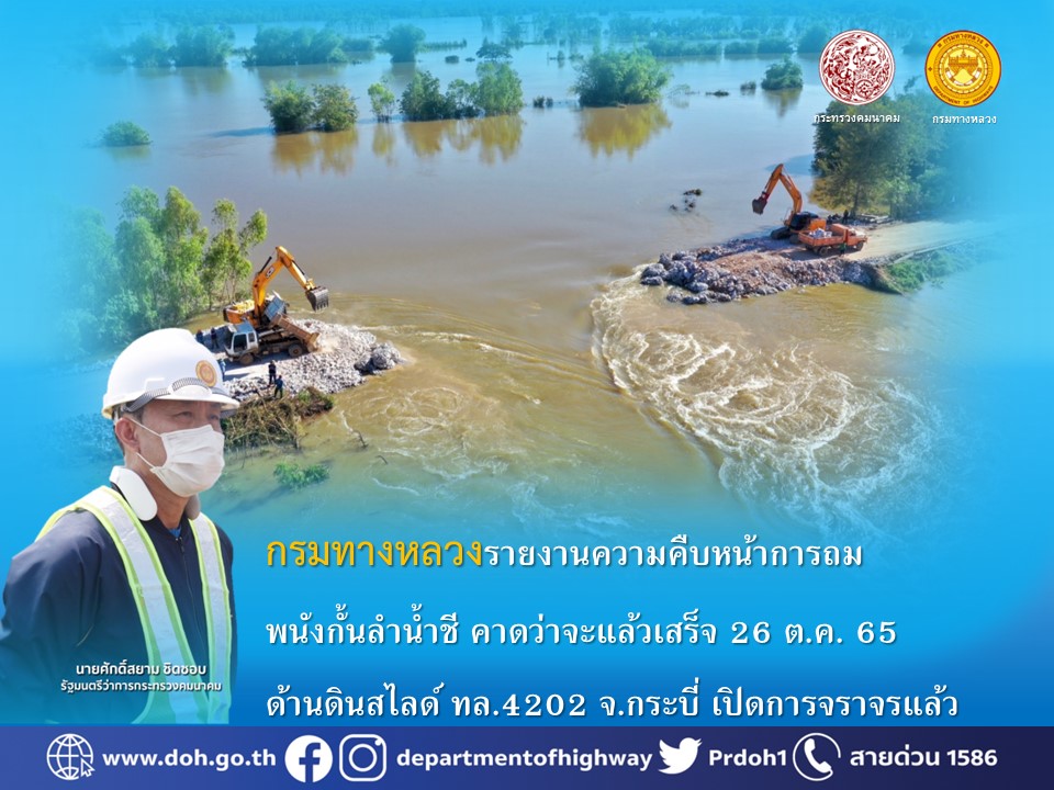 กรมทางหลวงรายงานความคืบหน้าการถมพนังกั้นลำน้ำชี คาดว่าจะแล้วเสร็จ 26 ต.ค. 65 ด้านดินสไลด์ ทล.4202 จ.กระบี่ เปิดการจราจรแล้ว
