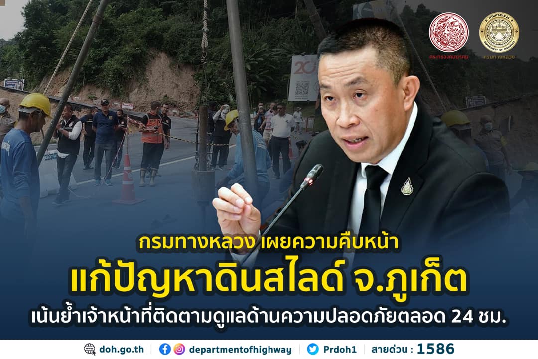 กรมทางหลวง เผยความคืบหน้าแก้ปัญหาดินสไลด์ จังหวัดภูเก็ต เน้นย้ำเจ้าหน้าที่ติดตามดูแลด้านความปลอดภัยตลอด 24 ชม.