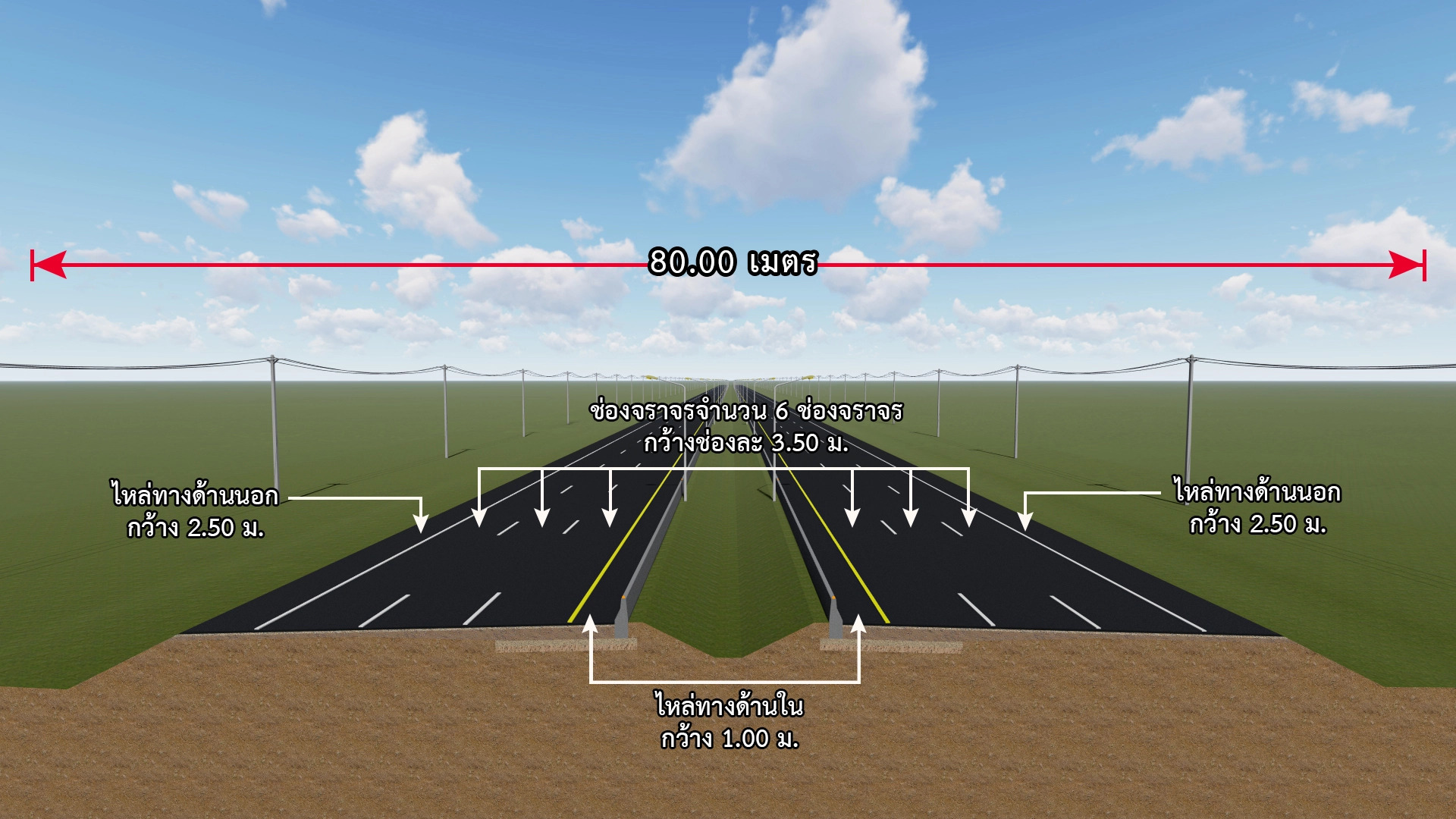 โดยรูปตัดทางหลวงของโครงการขยายทางเป็นทางหลวงขนาด 6 ช่องจราจร (ไป – กลับทิศทางละ 3 ช่องจราจร) กว้างช่องละ 3.50 เมตร  ไหล่ทางด้านนอกกว้าง 2.50 เมตร ไหล่ทางด้านในกว้าง 1 เมตร แบ่งทิศทางจราจรด้วยกาะกลางแบบกดเป็นร่อง (Depressed Median) กว้าง 10.60 เมตร และติดตั้งคอนกรีตแบริเออร์ (Concrete Barrier) บริเวณขอบไหล่ทางด้านในทั้งสองฝั่ง