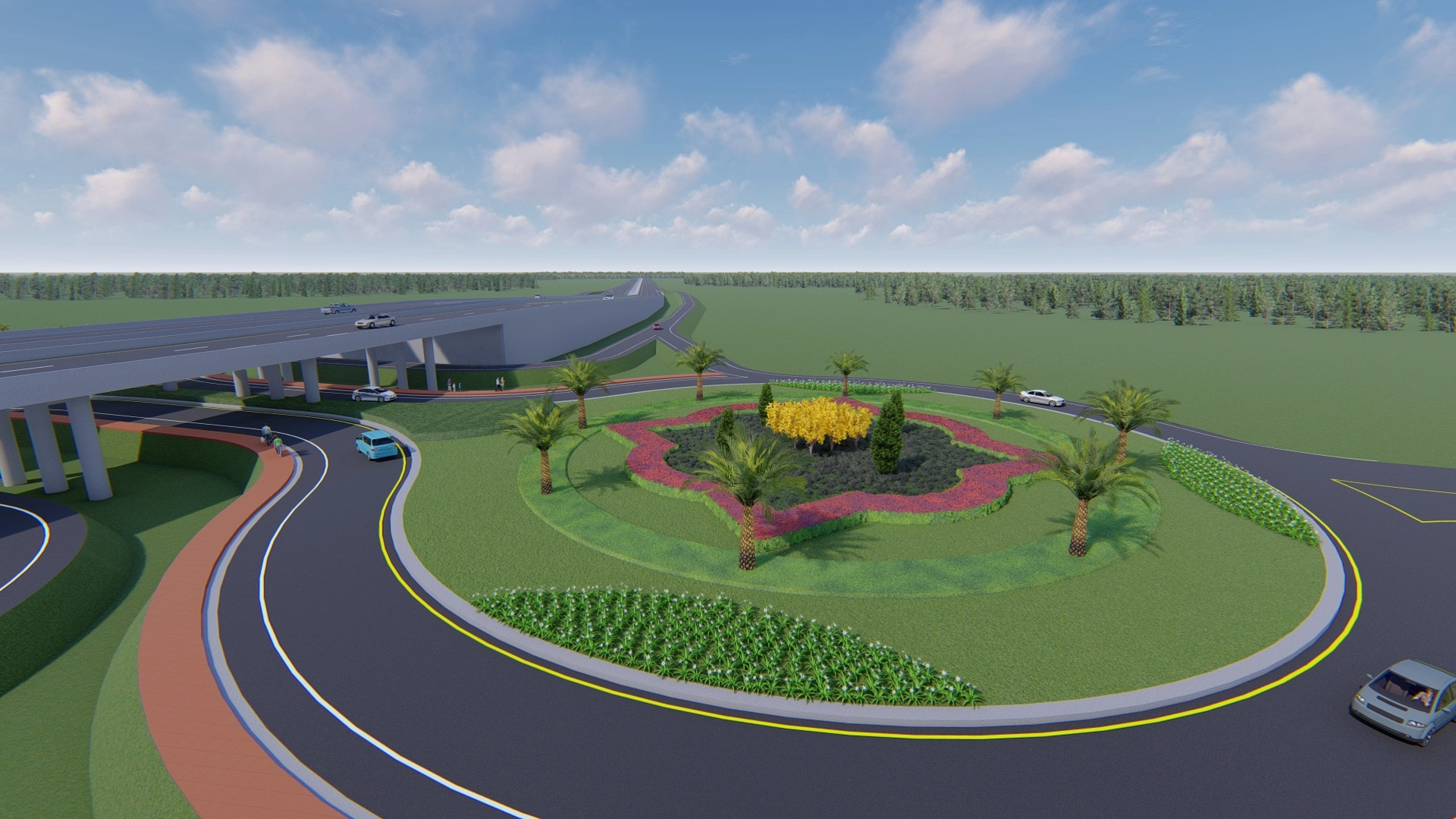นอกจากนี้ได้ออกแบบปรับภูมิทัศน์บริเวณทางแยกต่างระดับบริเวณวงเวียนเพื่อให้เกิดความร่มรื่นและสวยงาม รวมถึงได้ออกแบบเกาะและทางเดินลอดใต้สะพานเป็นพื้นคอนกรีตพิมพ์ลาย (Stamped Concrete) ให้มีสีสันสวยงาม