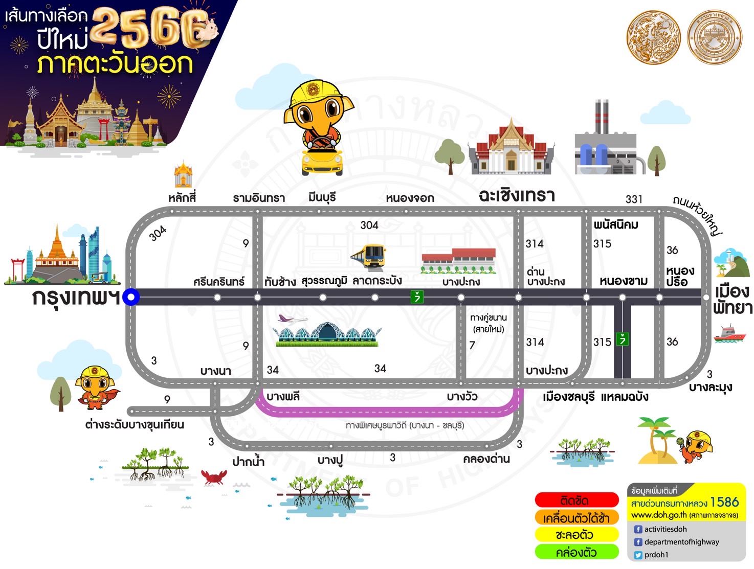 ทั้งนี้กรมทางหลวงขอความร่วมมือผู้ใช้ทางขับไม่ดื่มดื่มไม่ขับ วิถีชีวิตใหม่ ขับขี่อย่างปลอดภัย ไร้อุบัติเหตุ หากประชาชนต้องการสอบถามข้อมูลการเดินทางเพิ่มเติมหรือแจ้งเหตุด่วนเหตุร้ายระหว่างเดินทาง สามารถติดต่อได้ที่สายด่วนกรมทางหลวง 1586 (โทรฟรีทุกเครือข่ายตลอด 24 ชั่วโมง) สายด่วนมอเตอร์เวย์ 1586 กด 7 และตำรวจทางหลวง 1193