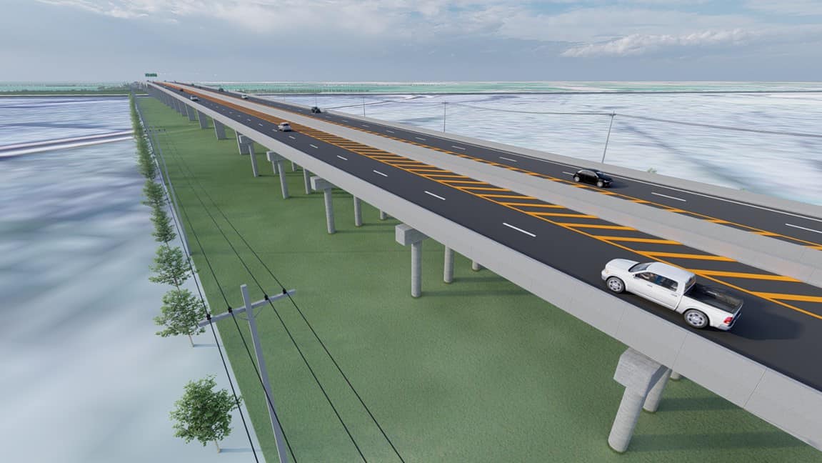 พร้อมออกแบบสะพานบกหรือสะพานยาวต่อเนื่อง ความยาวช่วงประมาณ 20-30 เมตร บริเวณตัดผ่านพื้นที่รับน้ำ 2 แห่ง 1.พื้นที่รับน้ำหลากทุ่งท่าวุ้ง และ 2.พื้นที่รับน้ำหลากทุ่งชัยนาทป่าสัก ป้องกันไม่ให้แนวเส้นทางเป็นคันกั้นน้ำและกีดขวางทางระบายน้ำ พร้อมจุดกลับรถ ระบบระบายน้ำ และระบบไฟฟ้าส่องสว่าง