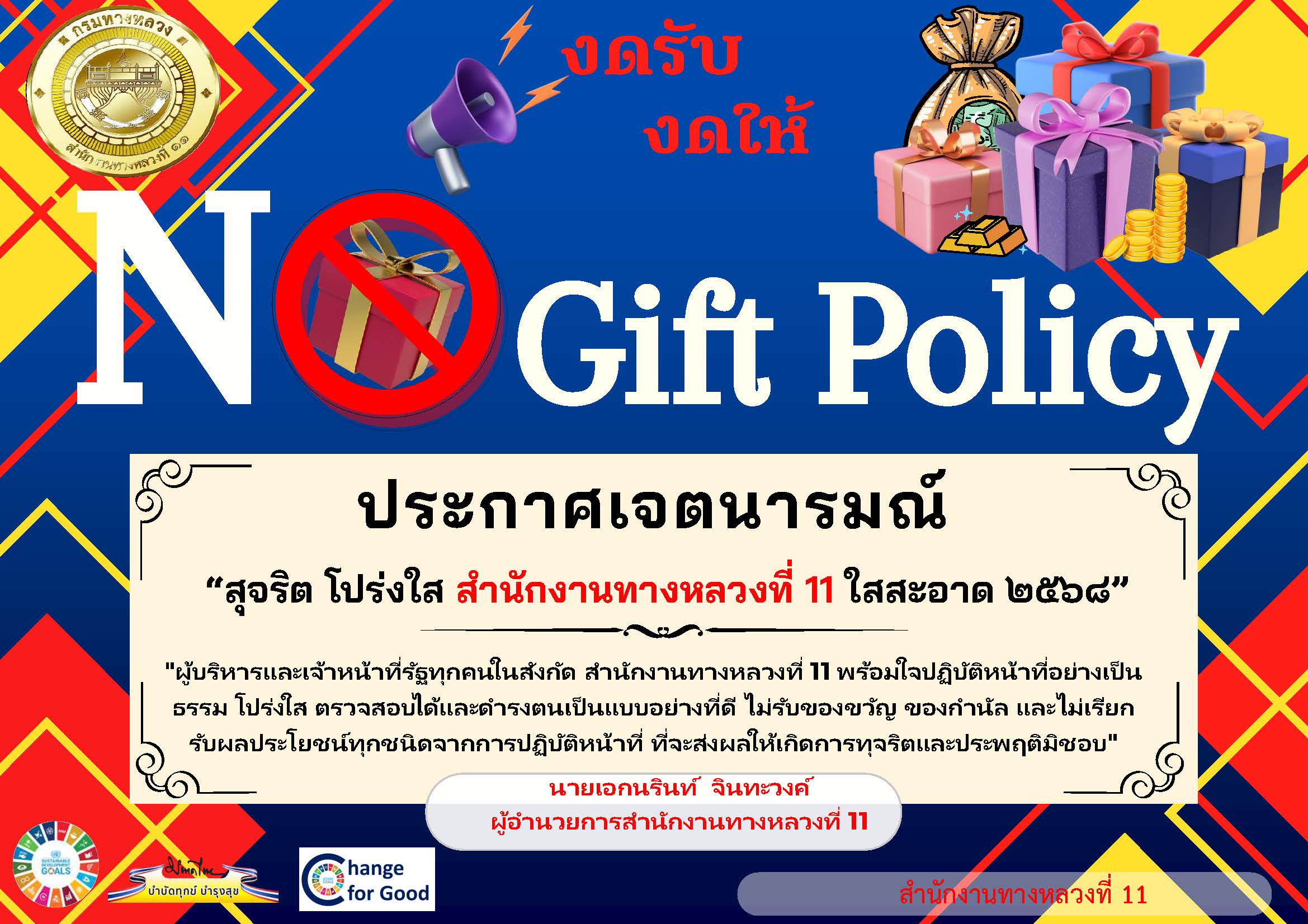 ประกาศเจตนารมณ์ "สุจริต โปร่งใส สำนักงานทางหลวงที่ 11ใสสะอาด 2568" และ "งดรับ งดให้" ของขวัญ ของกำนัลทุกชนิดจากการปฏิบัติหน้าที่ (No Gift Policy)
