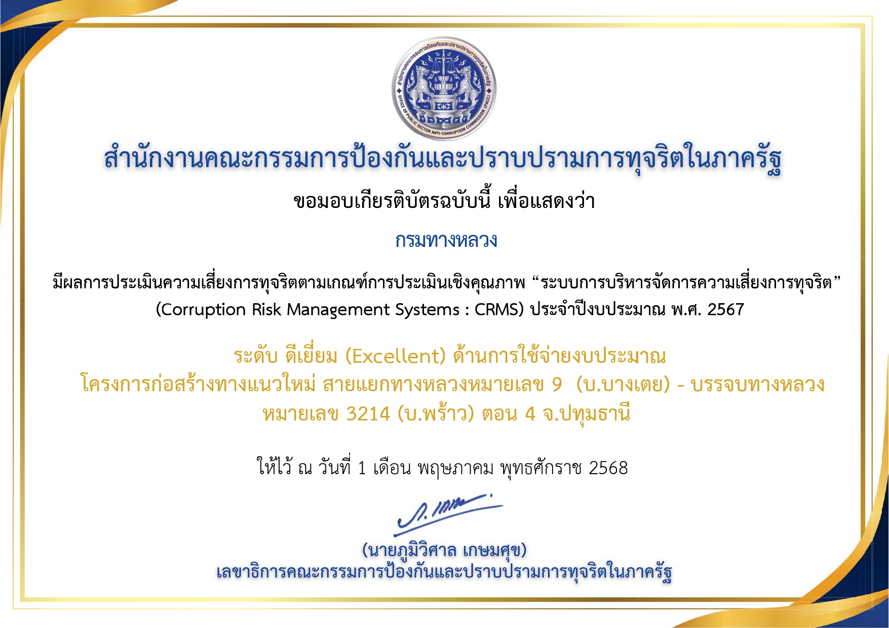ประชาสัมพันธ์เกียรติบัตรผลการประเมินความเสี่ยง การทุจริตตามเกณฑ์การประเมินเชิงคุณภาพ “ระบบการบริหารจัดการความเสี่ยงการทุจริต” (Corruption Risk Management Systems : CRMS) ประจำปีงบประมาณ พ.ศ.2567