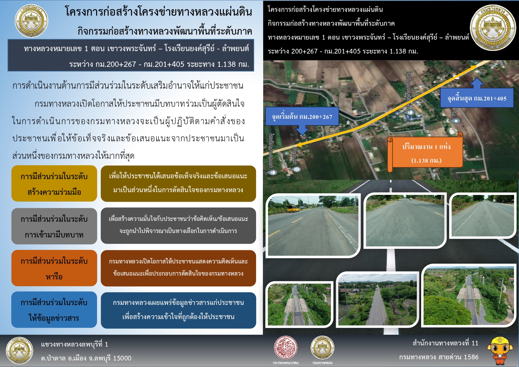 การจัดประชุมการมีส่วนร่วมของประชาชน ก่อสร้างโครงข่ายทางหลวงแผ่นดิน กิจกรรมก่อสร้างทางหลวงพัฒนาพื้นที่ระดับภาค งานก่อสร้างเพิ่มมาตรฐานทางหลวงระดับภาค ทางหลวงหมายเลข 1 ตอน เขาวงพระจันทร์ – โรงเรียนยงค์สุรีย์ - ลำพยนต์ ระหว่าง กม.200+267 - กม.201+405