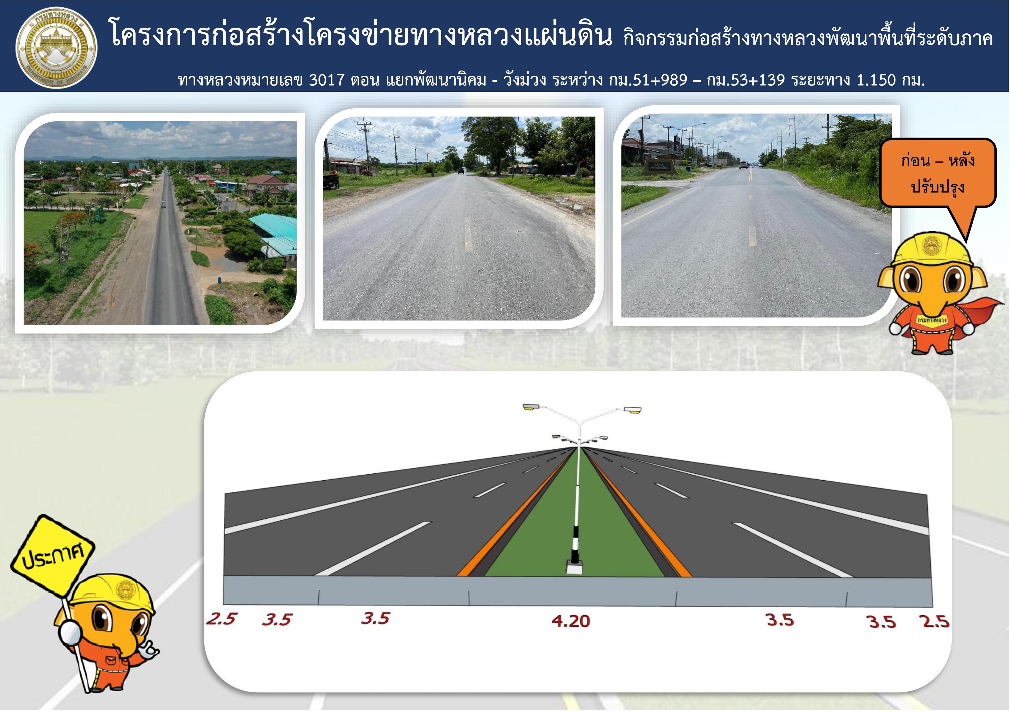 การจัดประชุมการมีส่วนร่วมของประชาชน ก่อสร้างโครงข่ายทางหลวงแผ่นดิน กิจกรรมก่อสร้างทางหลวงพัฒนาพื้นที่ระดับภาค งานก่อสร้างเพิ่มมาตรฐานทางหลวงระดับภาค ทางหลวงหมายเลข 3017 ตอน แยกพัฒนานิคม - วังม่วง ระหว่าง กม.51+989 - กม.53+139 ปริมาณงาน 1 แห่ง