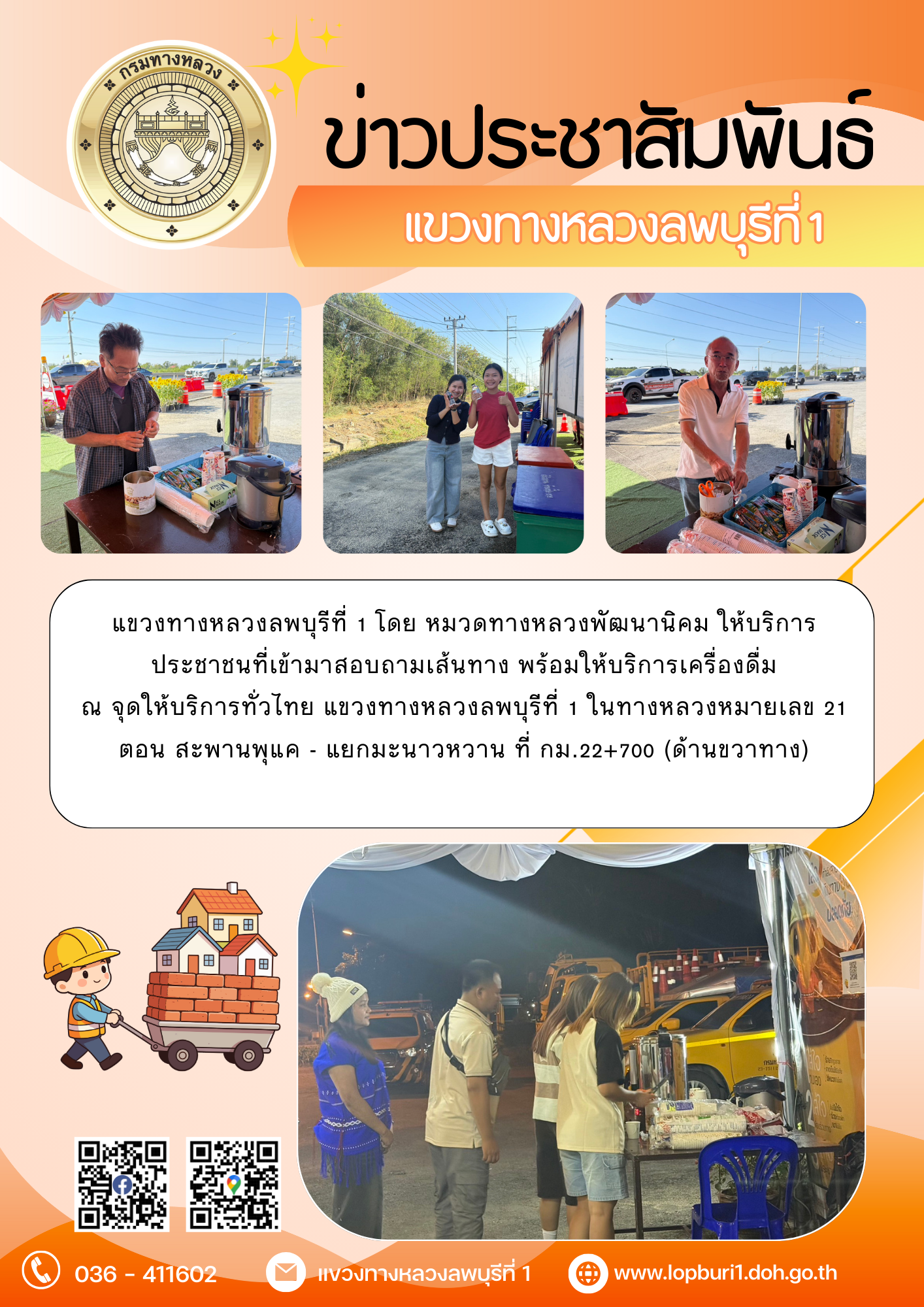 แขวงทางหลวงลพบุรีที่ 1 โดย หมวดทางหลวงพัฒนานิคม ให้บริการประชาชนที่เข้ามาสอบถามเส้นทาง พร้อมให้บริการเครื่องดื่ม