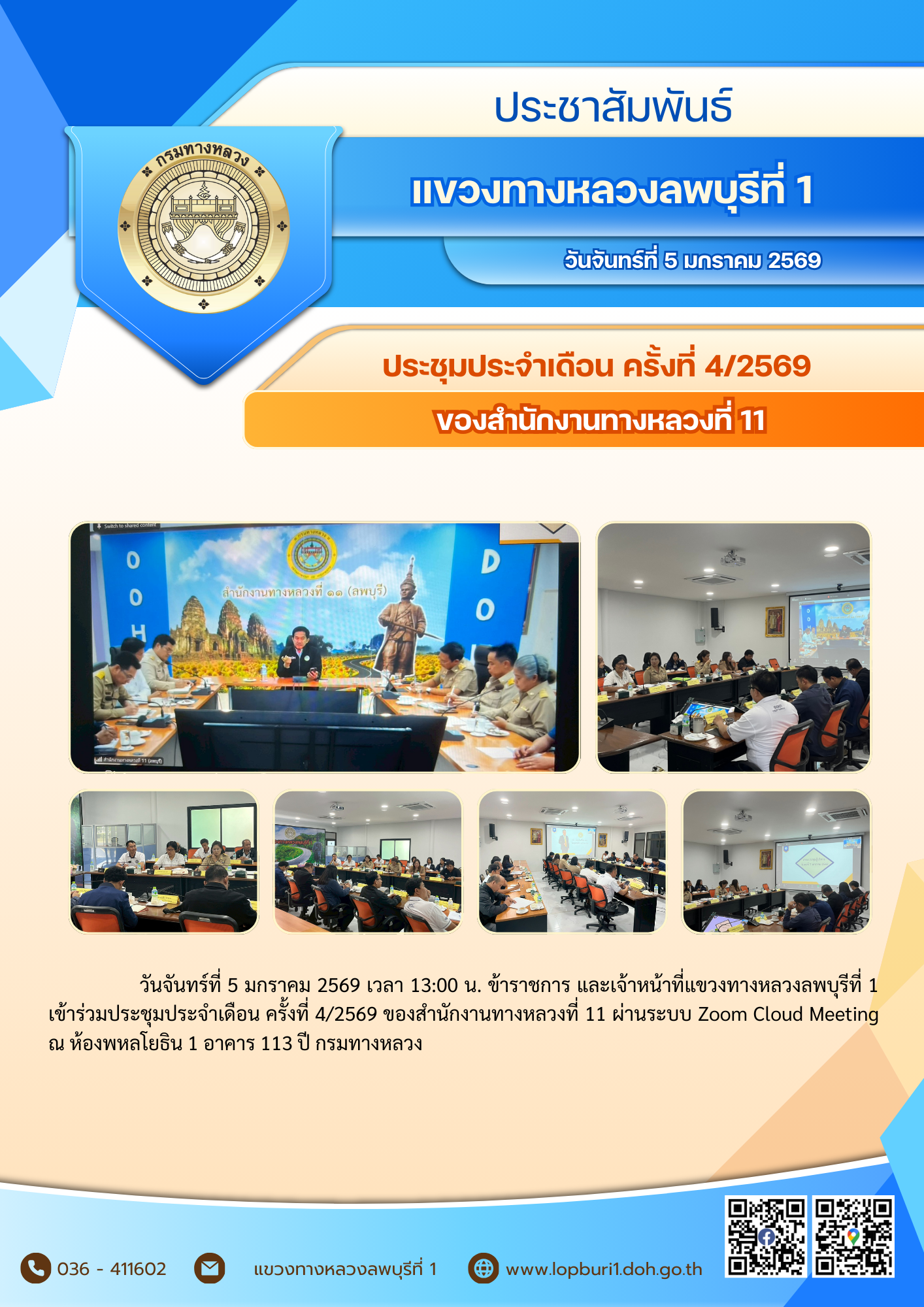 ข้าราชการ และเจ้าหน้าที่แขวงทางหลวงลพบุรีที่ 1 เข้าร่วมประชุมประจำเดือน ครั้งที่ 4/2569 ของสำนักงานทางหลวงที่ 11 ผ่านระบบ Zoom Cloud Meeting ณ ห้องพหลโยธิน 1 อาคาร 113 ปี กรมทางหลวง