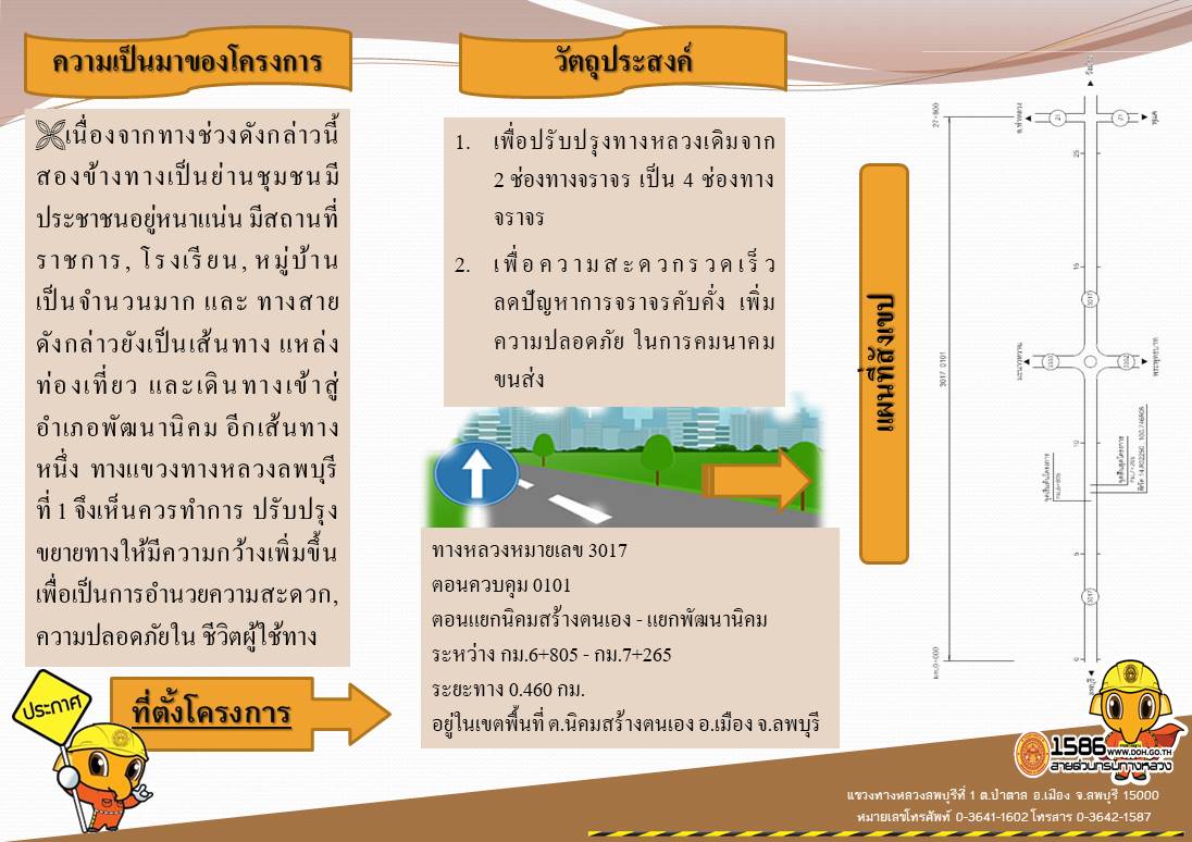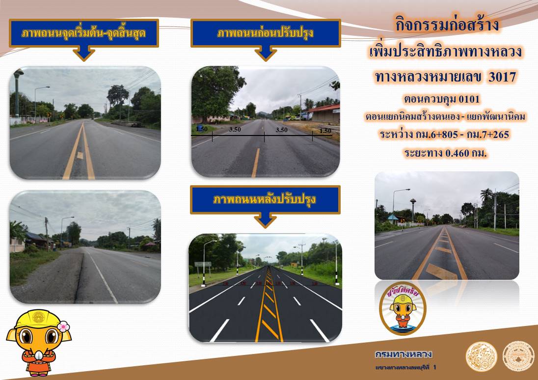 ด้วยกรมทางหลวงโดย แขวงทางหลวงลพบุรีที่ 1 มีโครงการที่จะดำเนินการก่อสร้างในปีงบประมาณ 2565 โครงการก่อสร้างโครงข่ายทางหลวงแผ่นดิน กิจกรรมก่อสร้างเพิ่มประสิทธิภาพทางหลวง ทางหลวงหมายเลข 3017 ตอน แยกนิคมสร้างตนเอง - แยกพัฒนานิคม ระหว่าง กม.6+805 - 7+265 ระยะทาง 0+460 กิโลเมตร วงเงินงบประมาณ 11,000,000.00 บาท