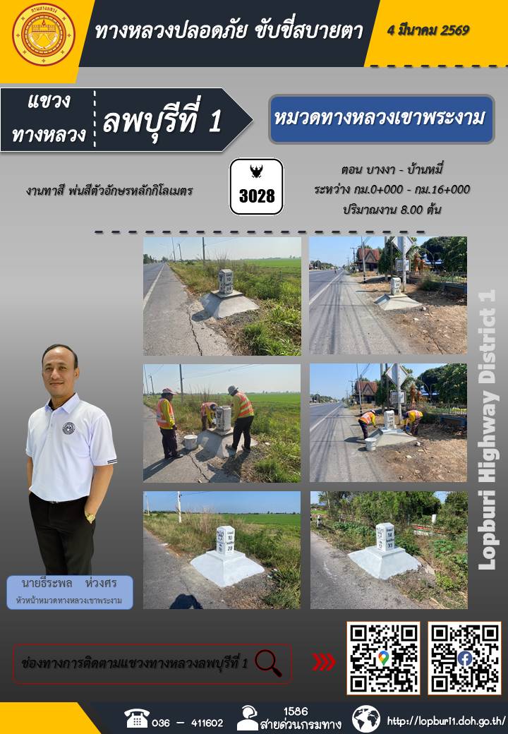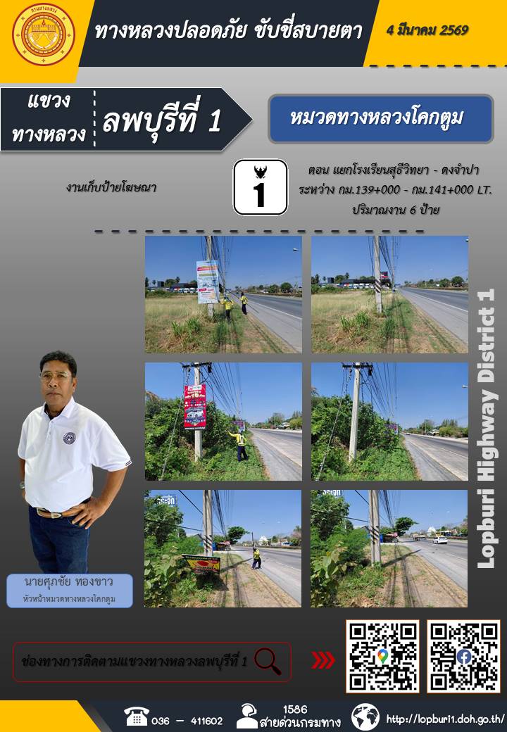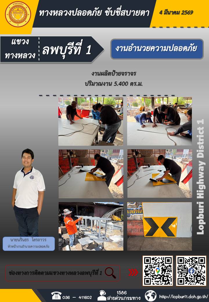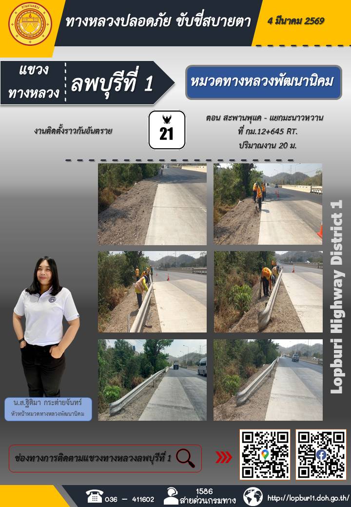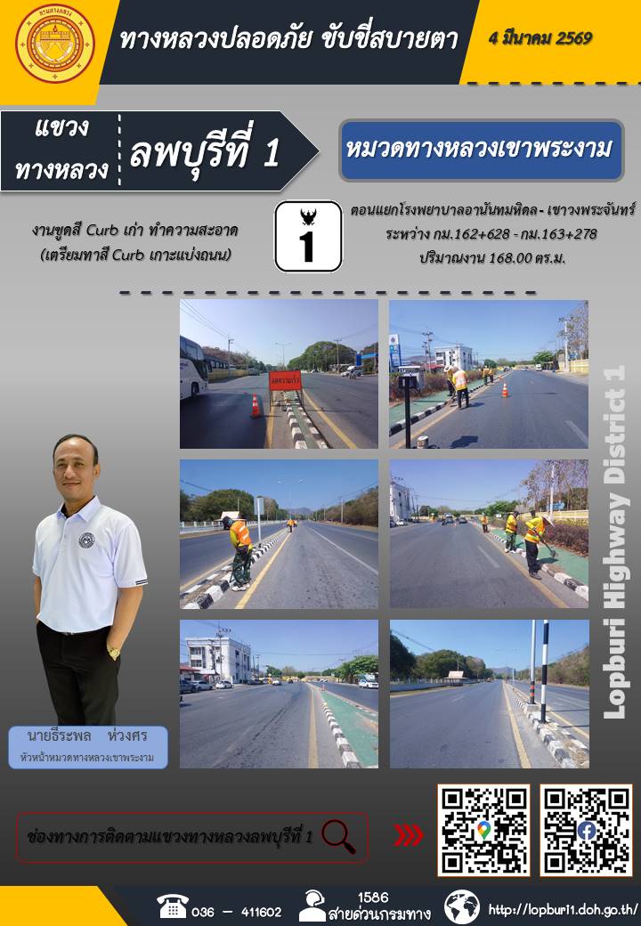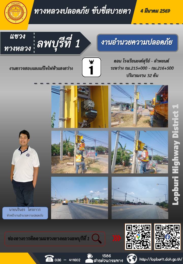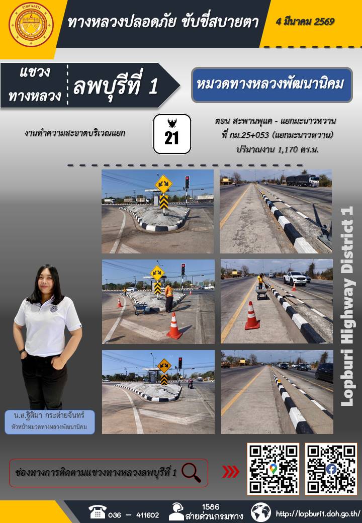 ทางหลวงปลอดภัยขับขี่สบายตา แขวงทางหลวงลพบุรีที่ 1 ประจำวันที่ 4 มีนาคม 2569