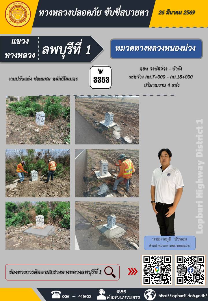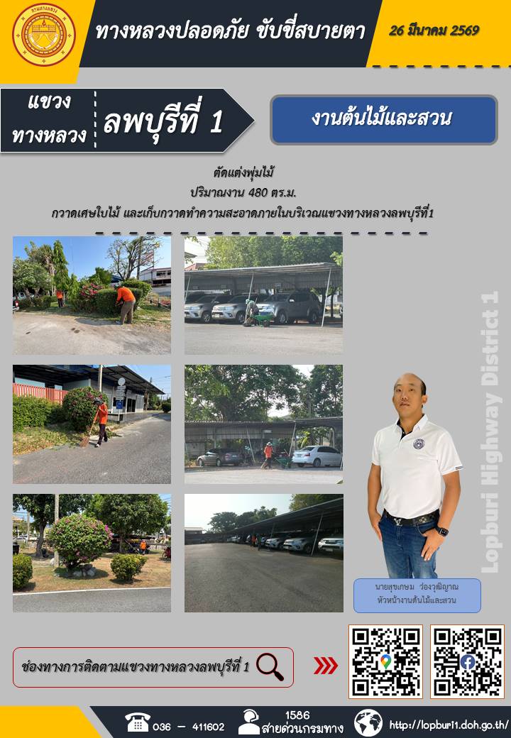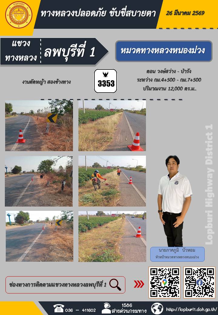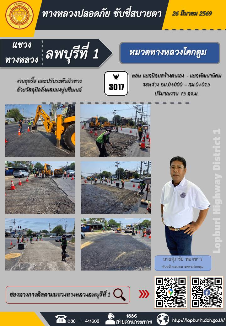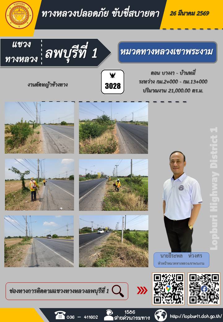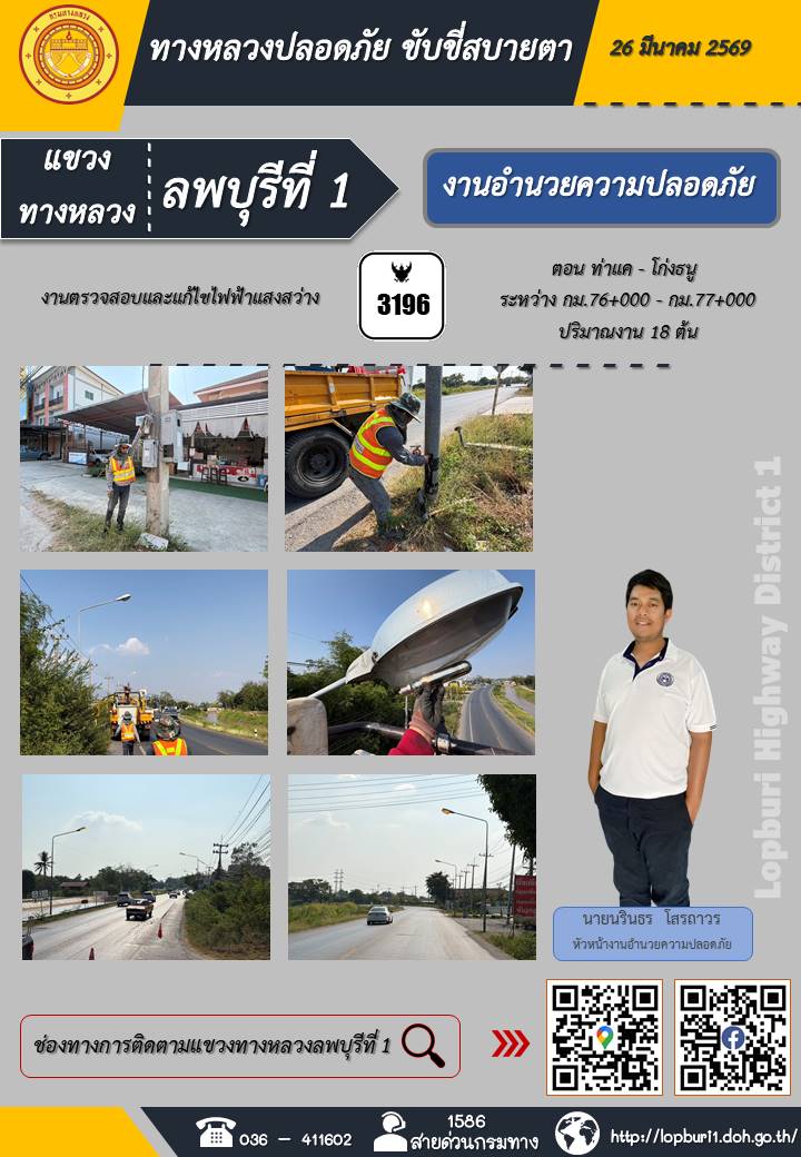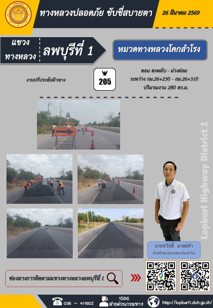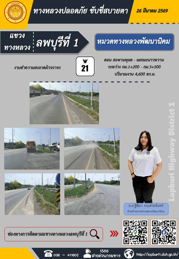 ทางหลวงปลอดภัยขับขี่สบายตา แขวงทางหลวงลพบุรีที่ 1 ประจำวันที่ 26 มีนาคม 2569