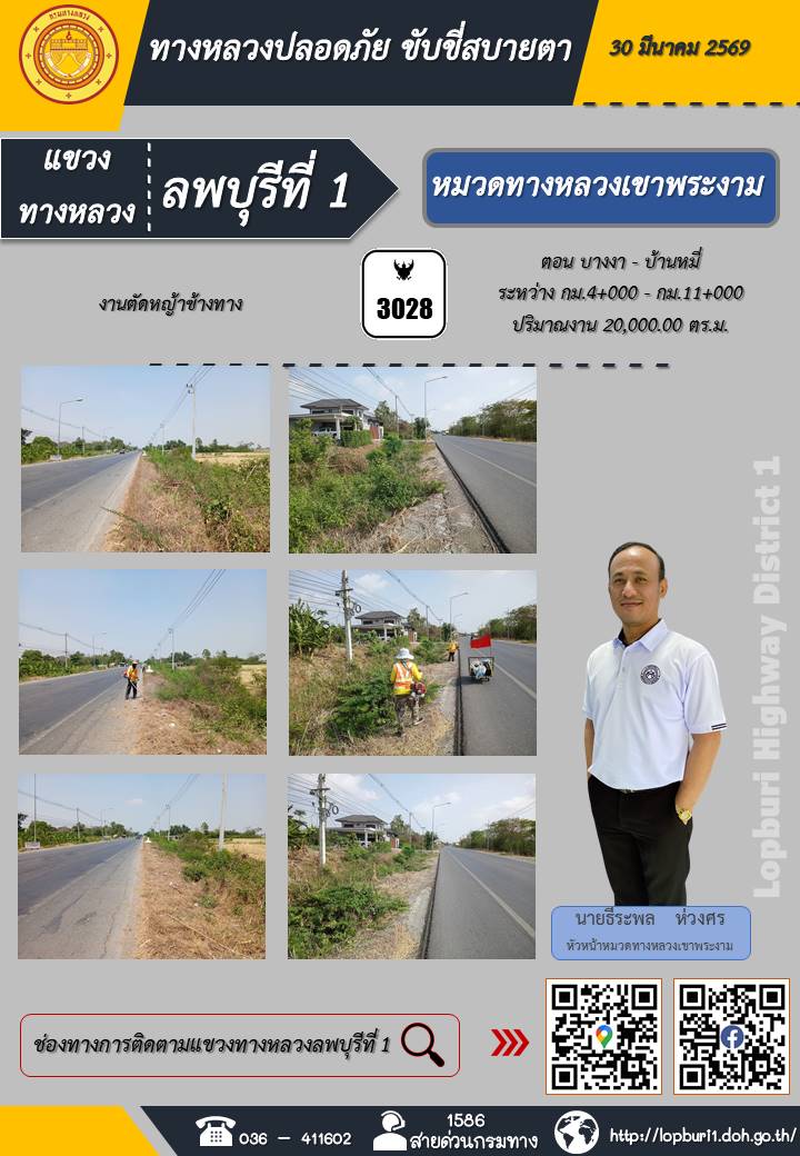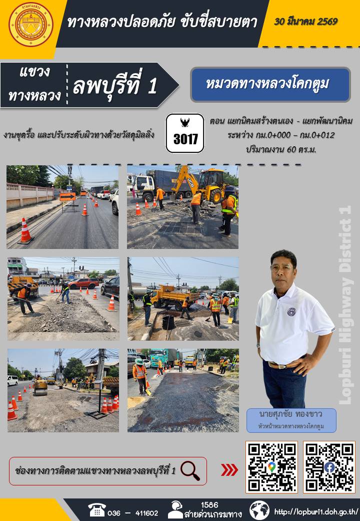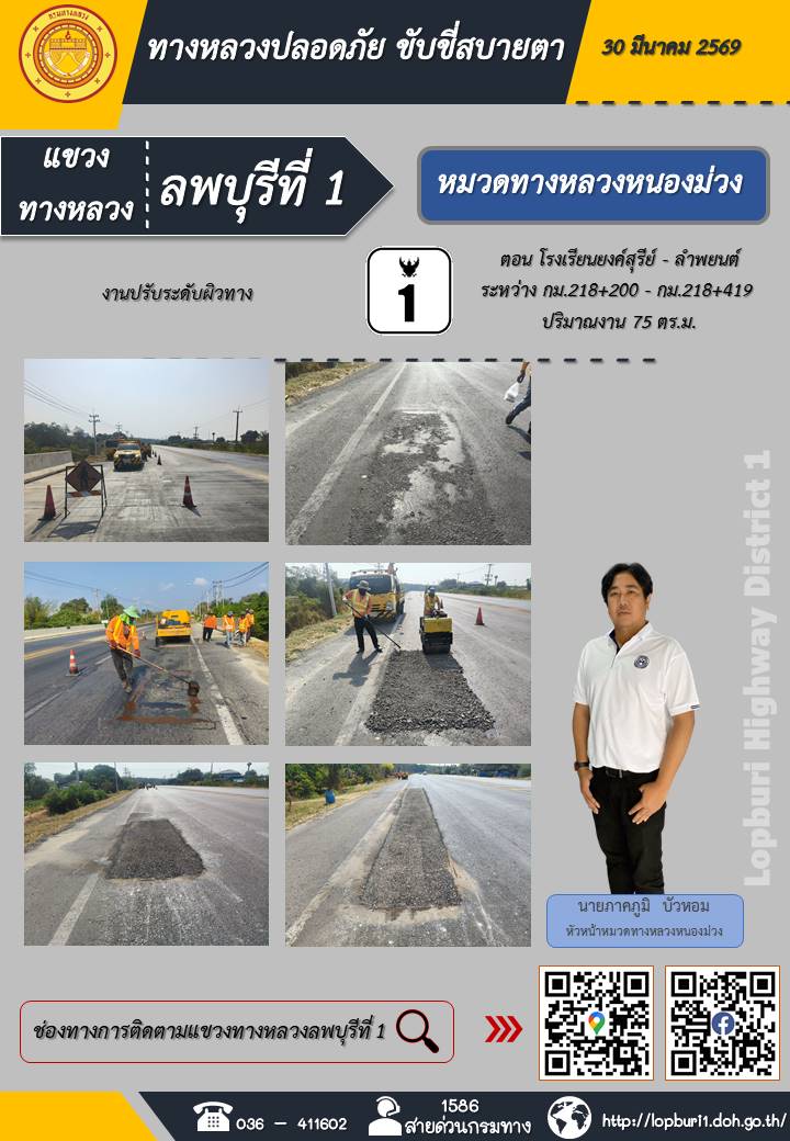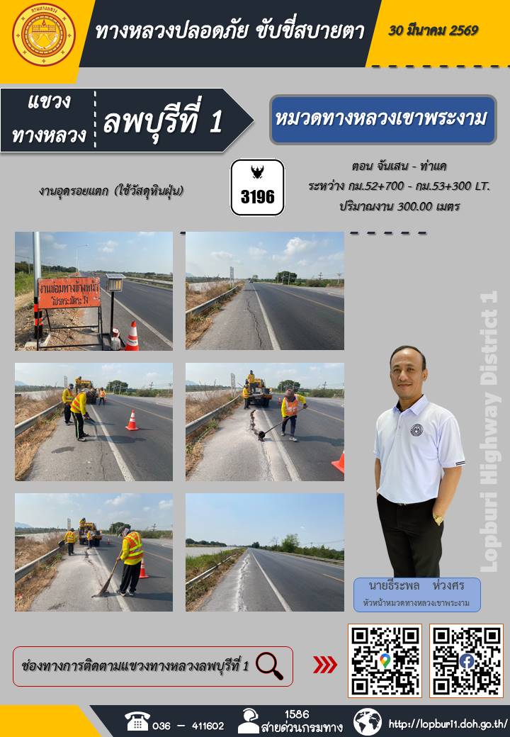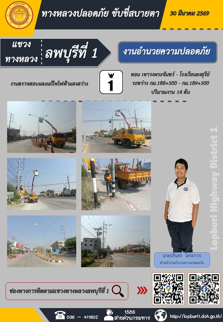 ทางหลวงปลอดภัยขับขี่สบายตา แขวงทางหลวงลพบุรีที่ 1 ประจำวันที่ 30 มีนาคม 2569