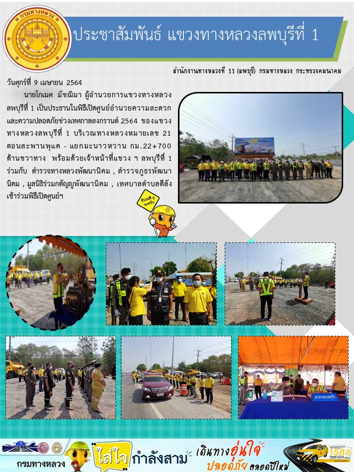 นายโกเมศ มัชฌิมา ผู้อำนวยการแขวงทางหลวงลพบุรีที่ 1 เป็นประธานในพิธีเปิดศูนย์อำนวยความสะดวกและความปลอดภัยช่วงเทศกาลสงกรานต์ 2564 ของแขวงทางหลวงลพบุรีที่ 1 บริเวณทางหลวงหมายเลข 21 ตอนสะพานพุแค - แยกมะนาวหวาน กม.22+700 ด้านขวาทาง พร้อมด้วยเจ้าหน้าที่แขวง ฯ ลพบุรีที่ 1 ร่วมกับ ตำรวจทางหลวงพัฒนานิคม , ตำรวจภูธรพัฒนานิคม , มูลนิธิร่วมกตัญญูพัฒนานิคม , เทศบาลตำบลดีลัง เข้าร่วมพิธีเปิดศูนย์ฯ