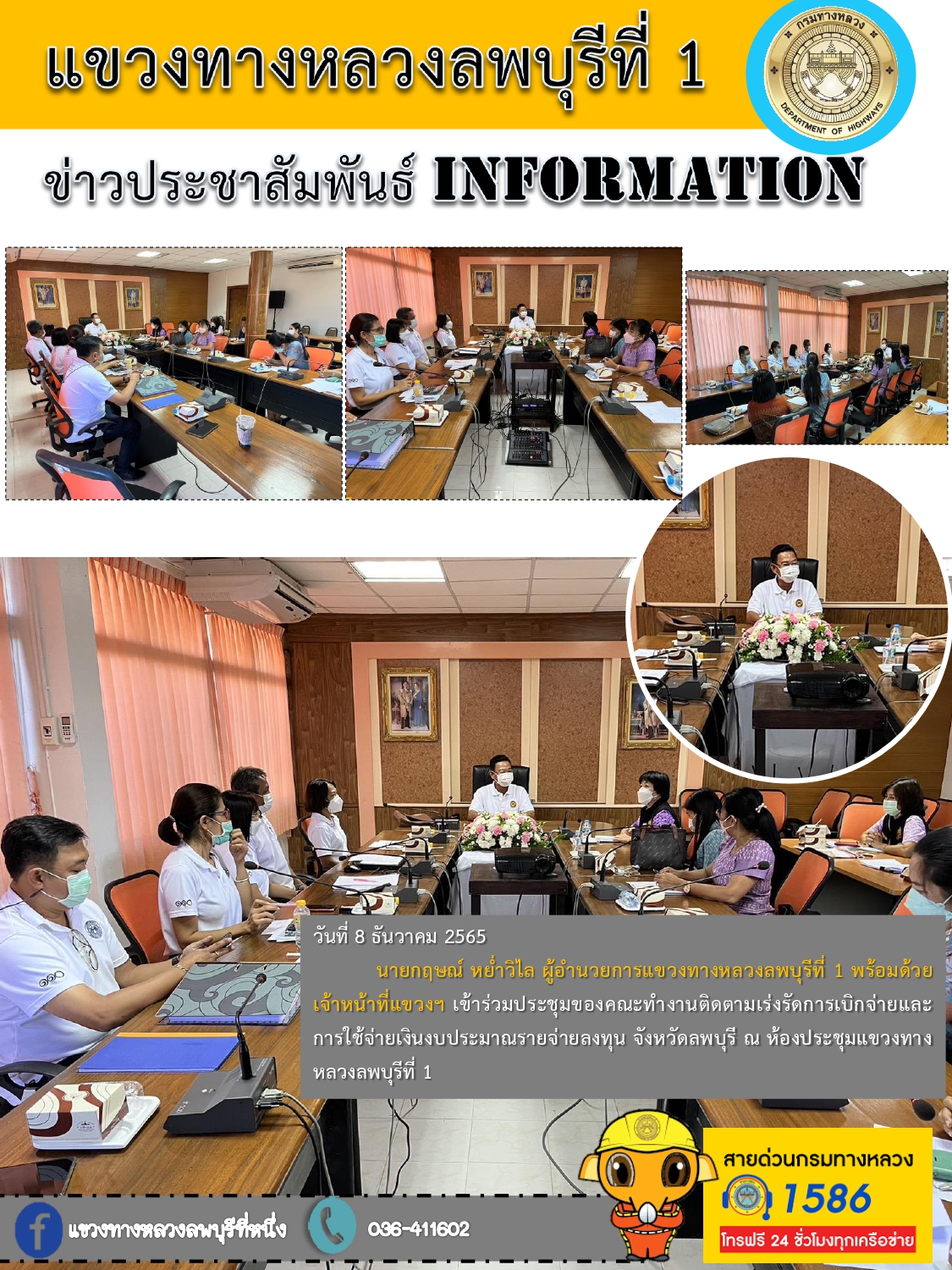 นายกฤษณ์ หย่ำวิไล ผู้อำนวยการแขวงทางหลวงลพบุรีที่ 1 พร้อมด้วยเจ้าหน้าที่แขวงฯ เข้าร่วมประชุมของคณะทำงานติดตามเร่งรัดการเบิกจ่ายและการใช้จ่ายเงินงบประมาณรายจ่ายลงทุน จังหวัดลพบุรี ณ ห้องประชุมแขวงทางหลวงลพบุรีที่ 1