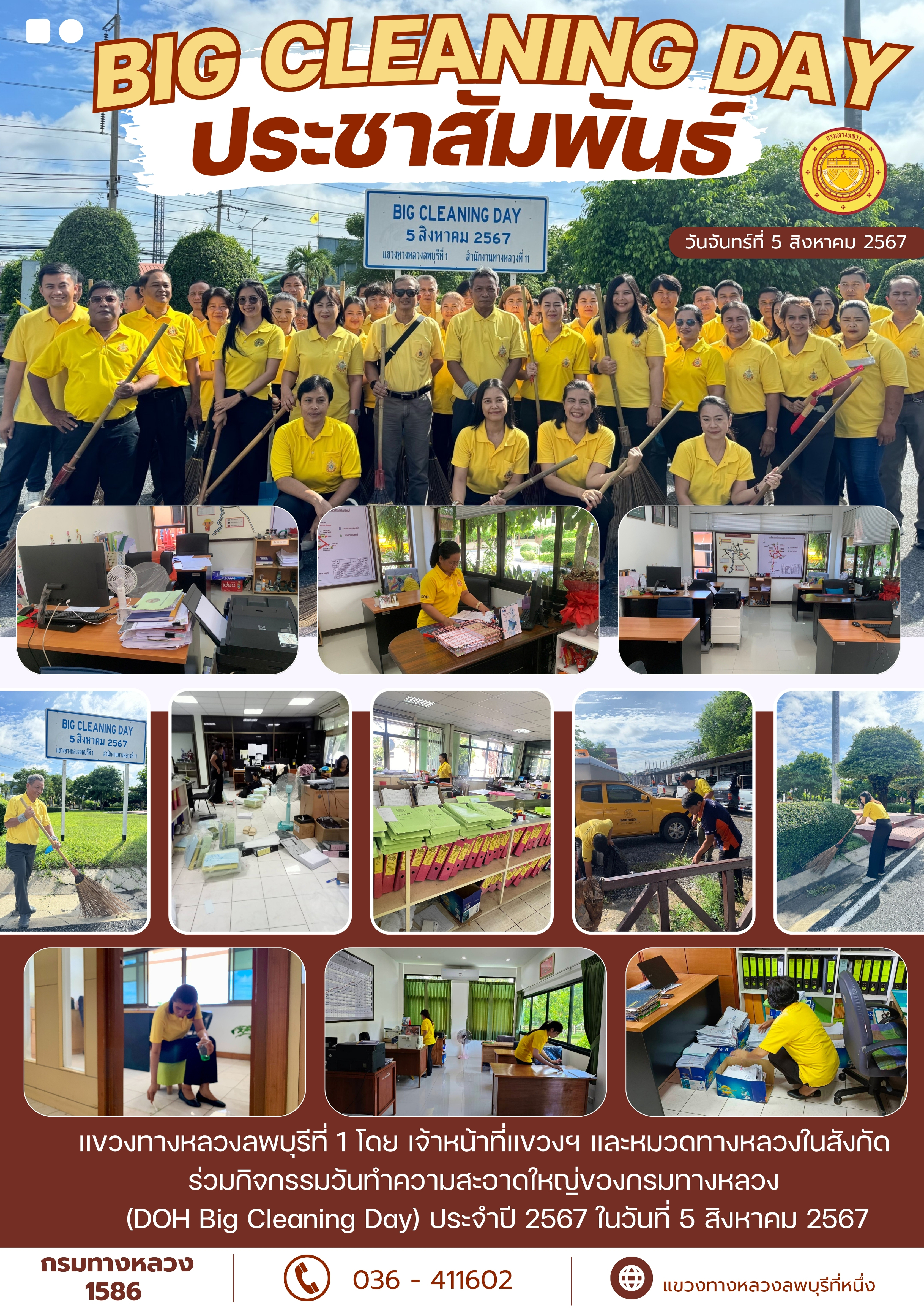 แขวงทางหลวงลพบุรีที่ 1 โดย เจ้าหน้าที่แขวงทางหลวงลพบุรีที่ 1 ร่วมกิจกรรมวันทำความสะอาดใหญ่ของกรมทางหลวง (Doh.BigCleaning Day) ประจำปี 2567 โดยดำเนินการทำความสะอาดภายในสำนักงาน บริเวณสำนักงานแขวงทางหลวงลพบุรีที่ 1 เพื่อเป็นการสร้างจิตสำนึกที่ดีให้แก่เจ้าหน้าที่ทุกระดับร่วมกันดำเนินกิจกรรม 5 ส. อย่างต่อเนื่อง อีกทั้งยังเป็นการสร้างระเบียบวินัยในองค์กร ณ สำนักงานแขวงทางหลวงลพบุรีที่ 1