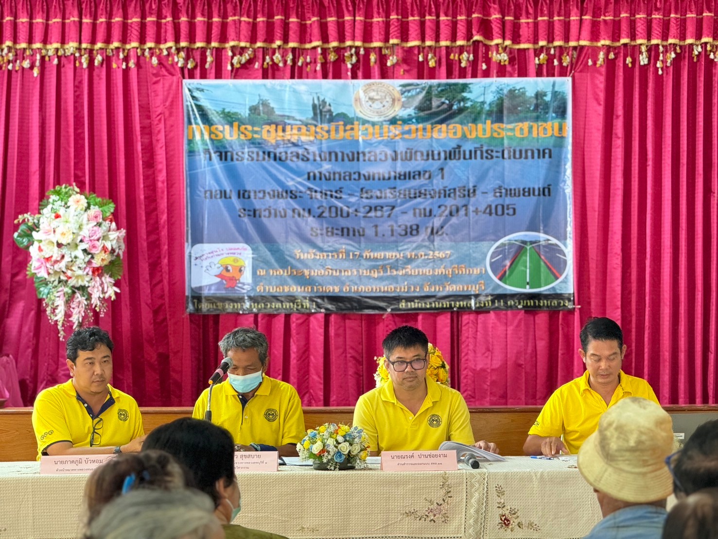 นายกฤษณ์ หย่ำวิไล ผู้อำนวยการแขวงทางหลวงลพบุรีที่ 1 มอบหมายให้นายไสว สุขสบาย รองผู้อำนวยการแขวงทางหลวงลพบุรีที่ 1 (ฝ่ายวิศวกรรม)  นายภาคภูมิ บัวหอม หัวหน้าหมวดทางหลวงหนองม่วง และเจ้าหน้าที่แขวงทางหลวงลพบุรีที่ 1 จัดการประชุมรับฟังการบรรยายพร้อมแสดงความคิดเห็น และร่วมแลกเปลี่ยนข้อมูล โครงการก่อสร้างโครงข่ายทางหลวงแผ่นดิน กิจกรรมก่อสร้างทางหลวงพัฒนาพื้นที่ระดับภาค งานก่อสร้างเพิ่มมาตรฐานทางหลวงระดับภาค ทางหลวงหมายเลข 1 ตอน เขาวงพระจันทร์ – โรงเรียนยงค์สุรีย์ - ลำพยนต์ ระหว่าง กม.200+267 - กม.201+405 โดยมีนายปรัชญานนท์ ปิ่นเพ็ชร์ นายช่างโยธาชำนาญงาน สำนักงานทางหลวงที่ 11 และนายณรงค์ ปานข่อยงาม วิศวกรโยธาปฏิบัติการ สำนักงานทางหลวงที่ 11 เป็นวิทยากรให้คำแนะนำแก่ตัวแทนหน่วยงานราชการที่เกี่ยวข้อง และประชาชนที่อาศัยอยู่ในบริเวณสองข้างทาง ณ หอประชุมอภิบาลราษฎร์ โรงเรียนยงค์สุรีศึกษา ตำบลชอนสารเดช อำเภอหนองม่วง จังหวัดลพบุรี