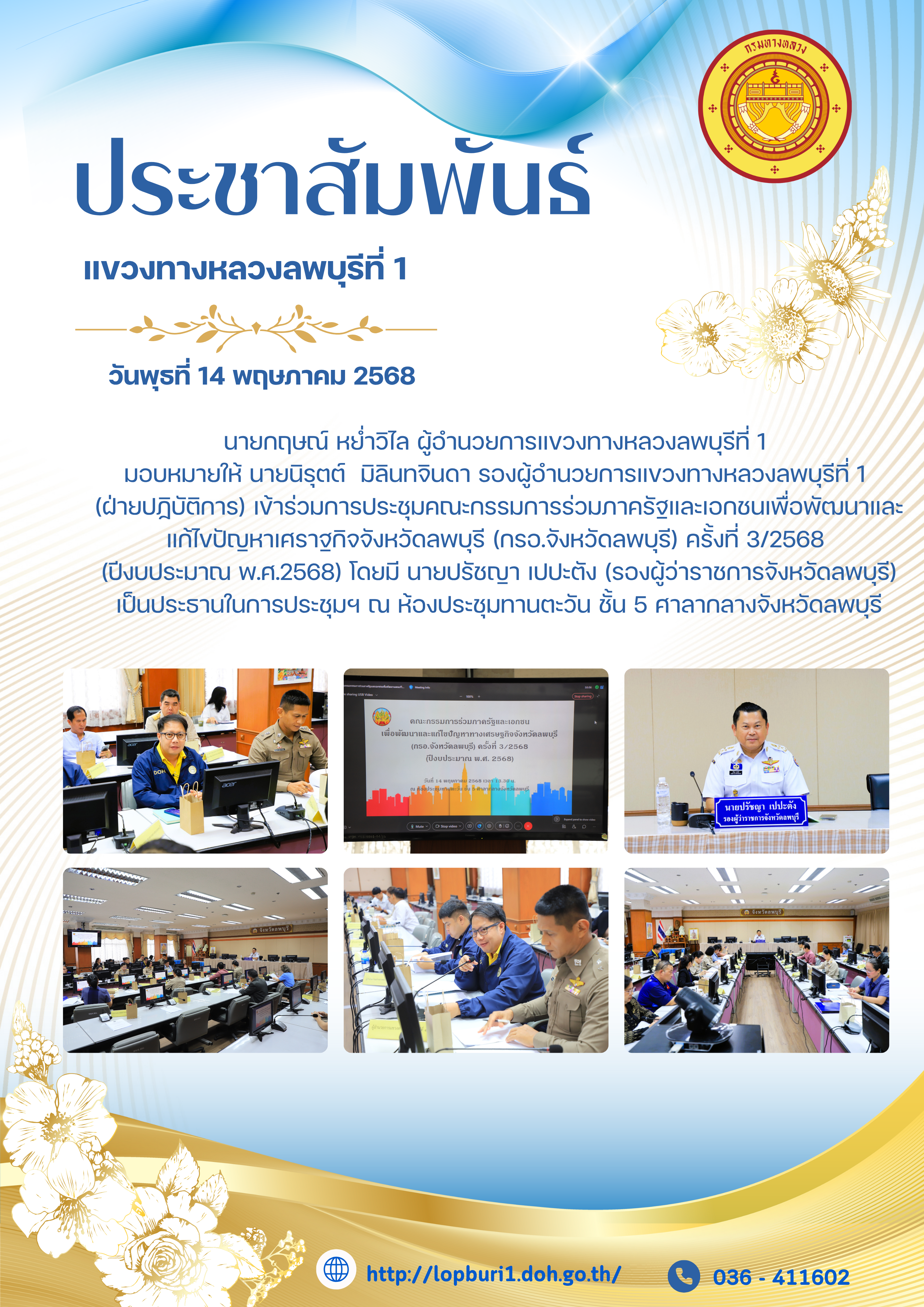 นายกฤษณ์ หย่ำวิไล ผู้อำนวยการแขวงทางหลวงลพบุรีที่ 1 มอบหมายให้ นายนิรุตต์ มิลินทจินดา รองผู้อำนวยการแขวงทางหลวงลพบุรีที่ 1 (ฝ่ายปฏิบัติการ) เข้าร่วมการประชุมคณะกรรมการร่วมภาครัฐและเอกชนเพื่อพัฒนาและแก้ไขปัญหาเศราฐกิจจังหวัดลพบุรี (กรอ.จังหวัดลพบุรี) ครั้งที่ 3/2568 (ปีงบประมาณ พ.ศ.2568) โดยมี นายปรัชญา เปปะตัง (รองผู้ว่าราชการจังหวัดลพบุรี) เป็นประธานในการประชุมฯ ณ ห้องประชุมทานตะวัน ชั้น 5 ศาลากลางจังหวัดลพบุรี