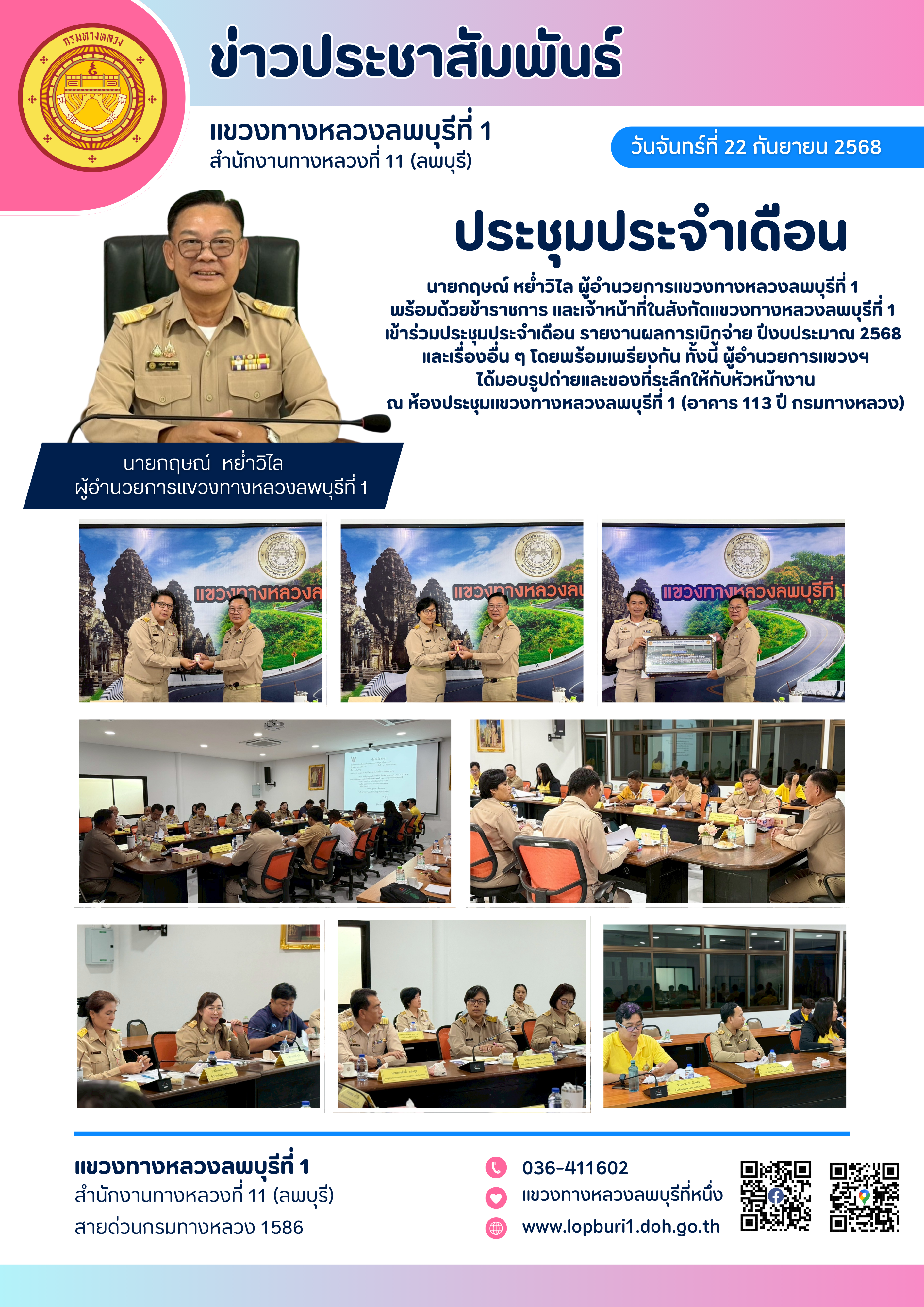 นายกฤษณ์ หย่ำวิไล ผู้อำนวยการแขวงทางหลวงลพบุรีที่ 1 ?พร้อมด้วยข้าราชการ และเจ้าหน้าที่ในสังกัดแขวงทางหลวงลพบุรีที่ 1?เข้าร่วมประชุมประจำเดือน รายงานผลการเบิกจ่าย ปีงบประมาณ 2568 และเรื่องอื่น ๆ โดยพร้อมเพรียงกัน ทั้งนี้ ผู้อำนวยการแขวงฯ ได้มอบรูปถ่ายและของที่ระลึกให้กับหัวหน้างาน ณ ห้องประชุมแขวงทางหลวงลพบุรีที่ 1 (อาคาร 113 ปี กรมทางหลวง)