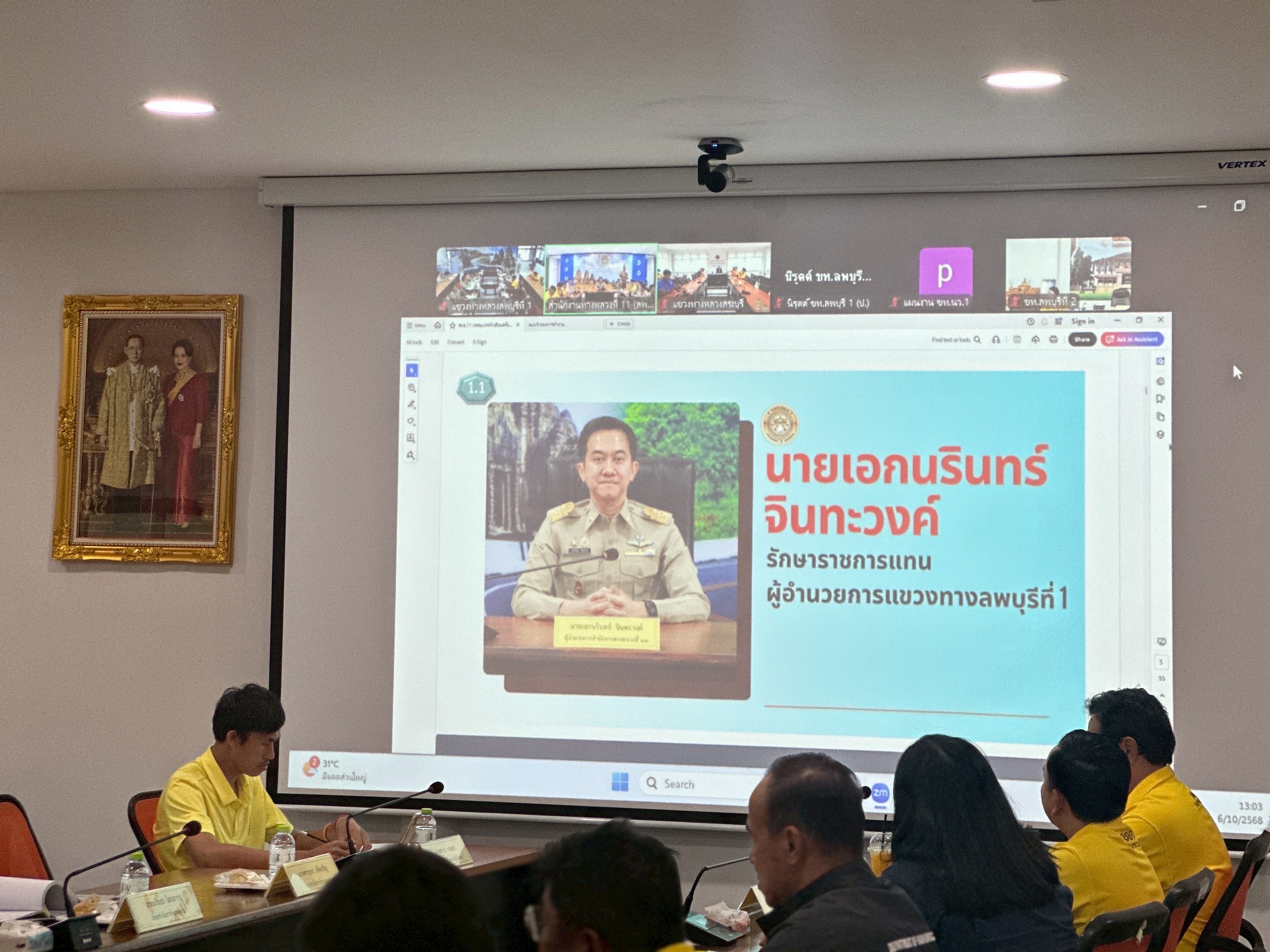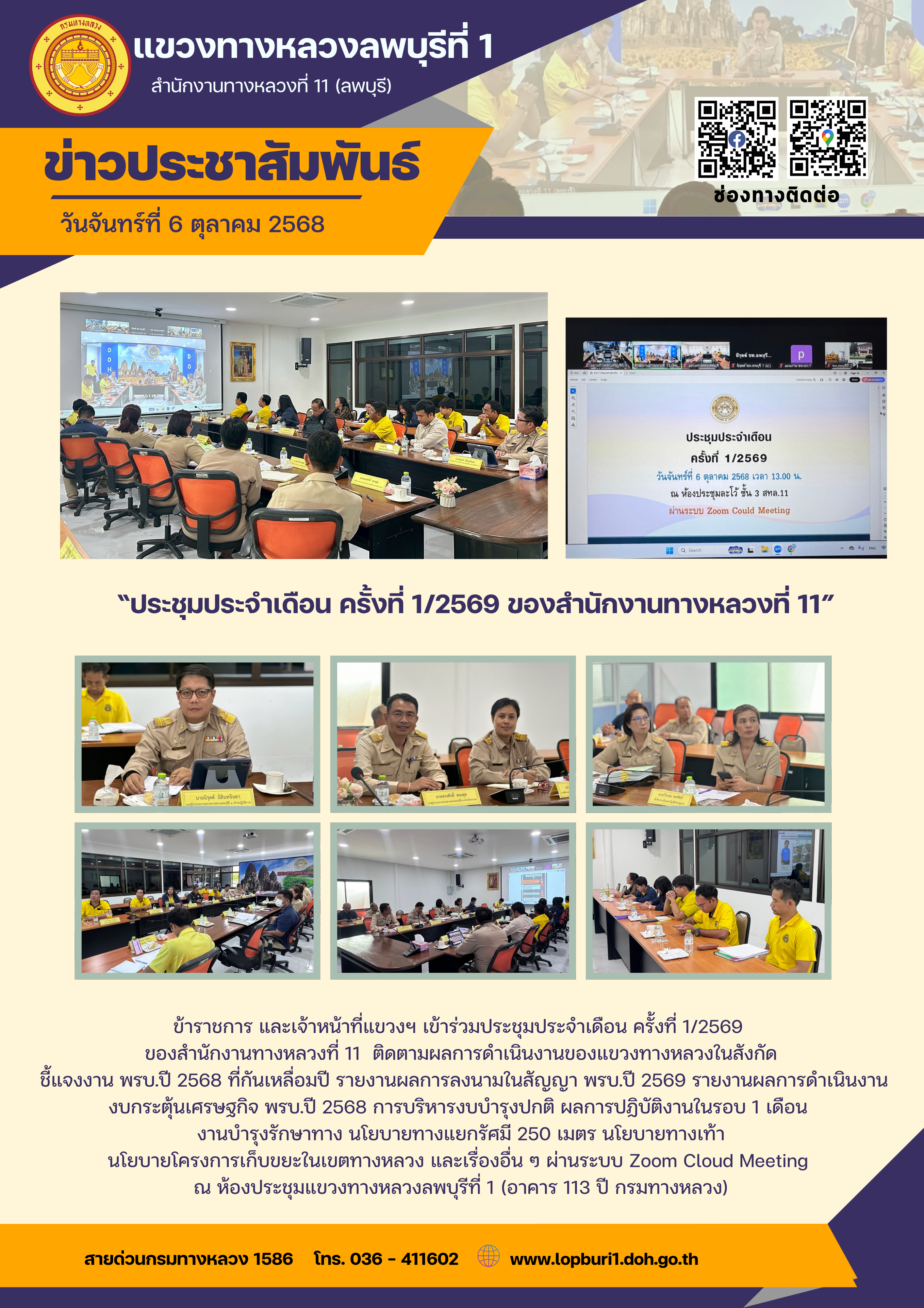 ข้าราชการ และเจ้าหน้าที่แขวงฯ เข้าร่วมประชุมประจำเดือน ครั้งที่ 1/2569 ของสำนักงานทางหลวงที่ 11 ติดตามผลการดำเนินงานของแขวงทางหลวงในสังกัด ชี้แจงงาน พรบ.ปี 2568 ที่กันเหลื่อมปี รายงานผลการลงนามในสัญญา พรบ.ปี 2569 รายงานผลการดำเนินงานงบกระตุ้นเศรษฐกิจ พรบ.ปี 2568 การบริหารงบบำรุงปกติ ผลการปฏิบัติงานในรอบ 1 เดือน งานบำรุงรักษาทาง นโยบายทางแยกรัศมี 250 เมตร นโยบายทางเท้า นโยบายโครงการเก็บขยะในเขตทางหลวง และเรื่องอื่น ๆ ผ่านระบบ Zoom Cloud Meeting ณ ห้องประชุมแขวงทางหลวงลพบุรีที่ 1 (อาคาร 113 ปี กรมทางหลวง)