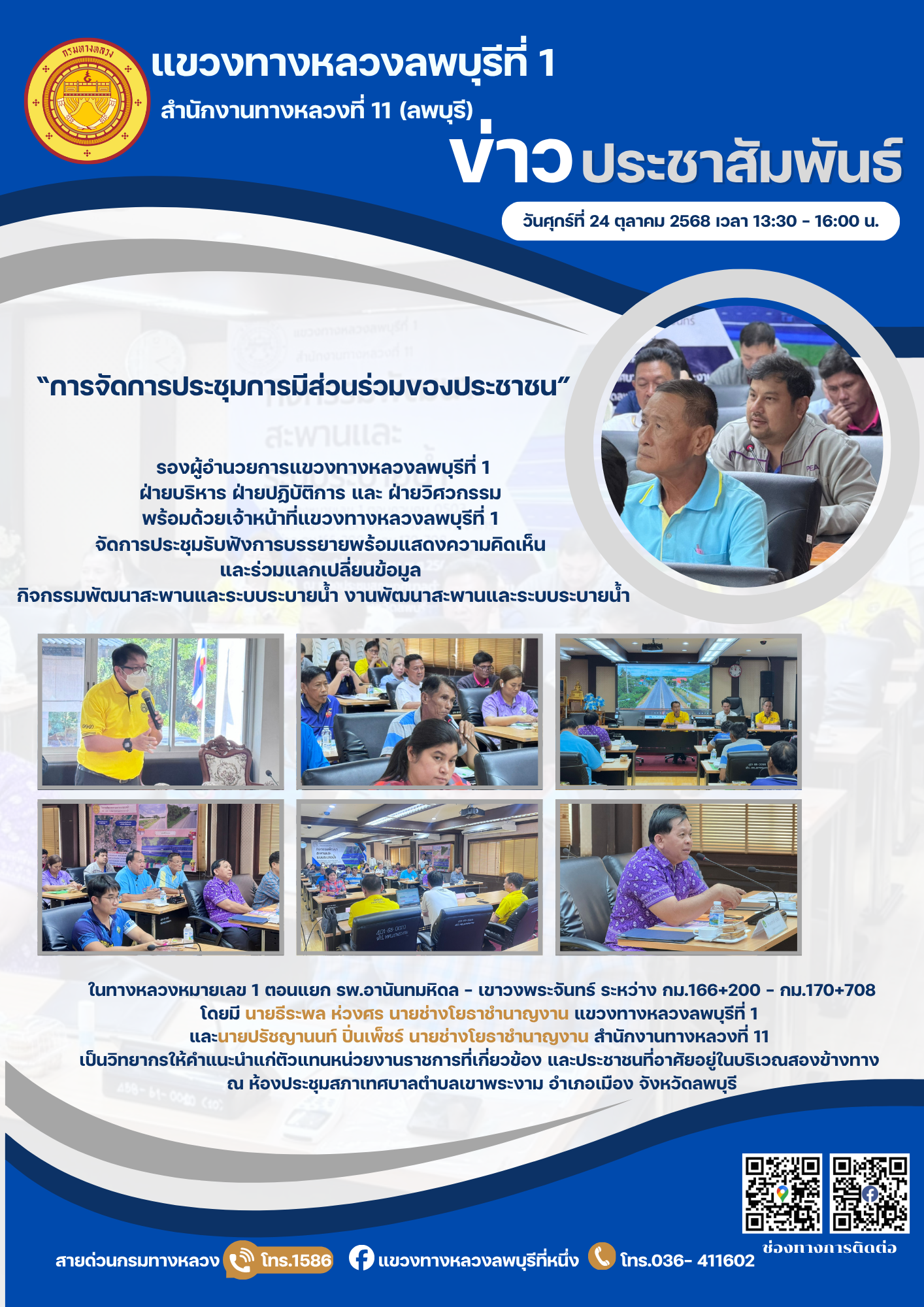 รองผู้อำนวยการแขวงทางหลวงลพบุรีที่ 1 ฝ่ายบริหาร ฝ่ายปฏิบัติการ และ ฝ่ายวิศวกรรม พร้อมด้วยเจ้าหน้าที่แขวงทางหลวงลพบุรีที่ 1 จัดการประชุมรับฟังการบรรยายพร้อมแสดงความคิดเห็น และร่วมแลกเปลี่ยนข้อมูลกิจกรรมพัฒนาสะพานและระบบระบายน้ำ งานพัฒนาสะพานและระบบระบายน้ำ ในทางหลวงหมายเลข 1 ตอนแยก รพ.อานันทมหิดล – เขาวงพระจันทร์ ระหว่าง กม.166+200 – กม.170+708 โดยมี นายธีระพล ห่วงศร นายช่างโยธาชำนาญงาน แขวงทางหลวงลพบุรีที่ 1 และนายปรัชญานนท์ ปิ่นเพ็ชร์ นายช่างโยธาชำนาญงาน สำนักงานทางหลวงที่ 11 เป็นวิทยากรให้คำแนะนำแก่ตัวแทนหน่วยงานราชการที่เกี่ยวข้อง และประชาชนที่อาศัยอยู่ในบริเวณสองข้างทาง ณ ห้องประชุมสภาเทศบาลตำบลเขาพระงาม อำเภอเมือง จังหวัดลพบุรี