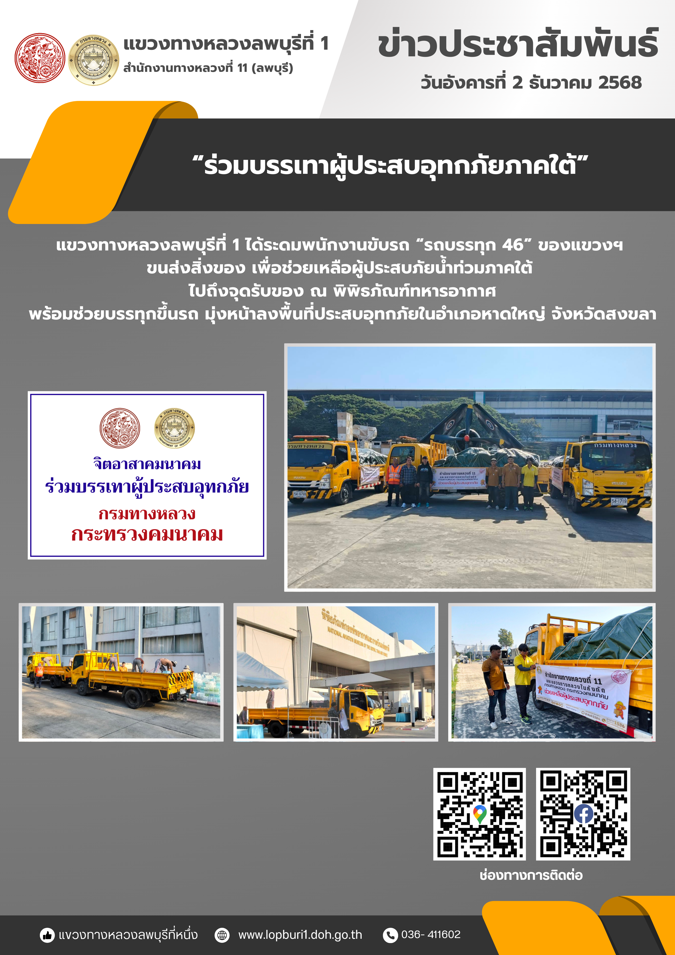 แขวงทางหลวงลพบุรีที่ 1 ได้ระดมพนักงานขับรถ “รถบรรทุก 46” ของแขวงฯ ขนส่งสิ่งของ เพื่อช่วยเหลือผู้ประสบภัยน้ำท่วมภาคใต้ ไปถึงจุดรับของ ณ พิพิธภัณฑ์ทหารอากาศ พร้อมช่วยบรรทุกขึ้นรถ มุ่งหน้าลงพื้นที่ประสบอุทกภัยในอำเภอหาดใหญ่ จังหวัดสงขลา