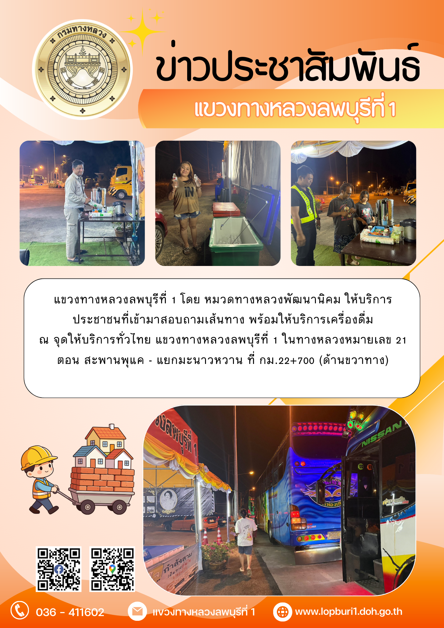แขวงทางหลวงลพบุรีที่ 1 โดย หมวดทางหลวงพัฒนานิคม ให้บริการประชาชนที่เข้ามาสอบถามเส้นทาง พร้อมให้บริการเครื่องดื่ม