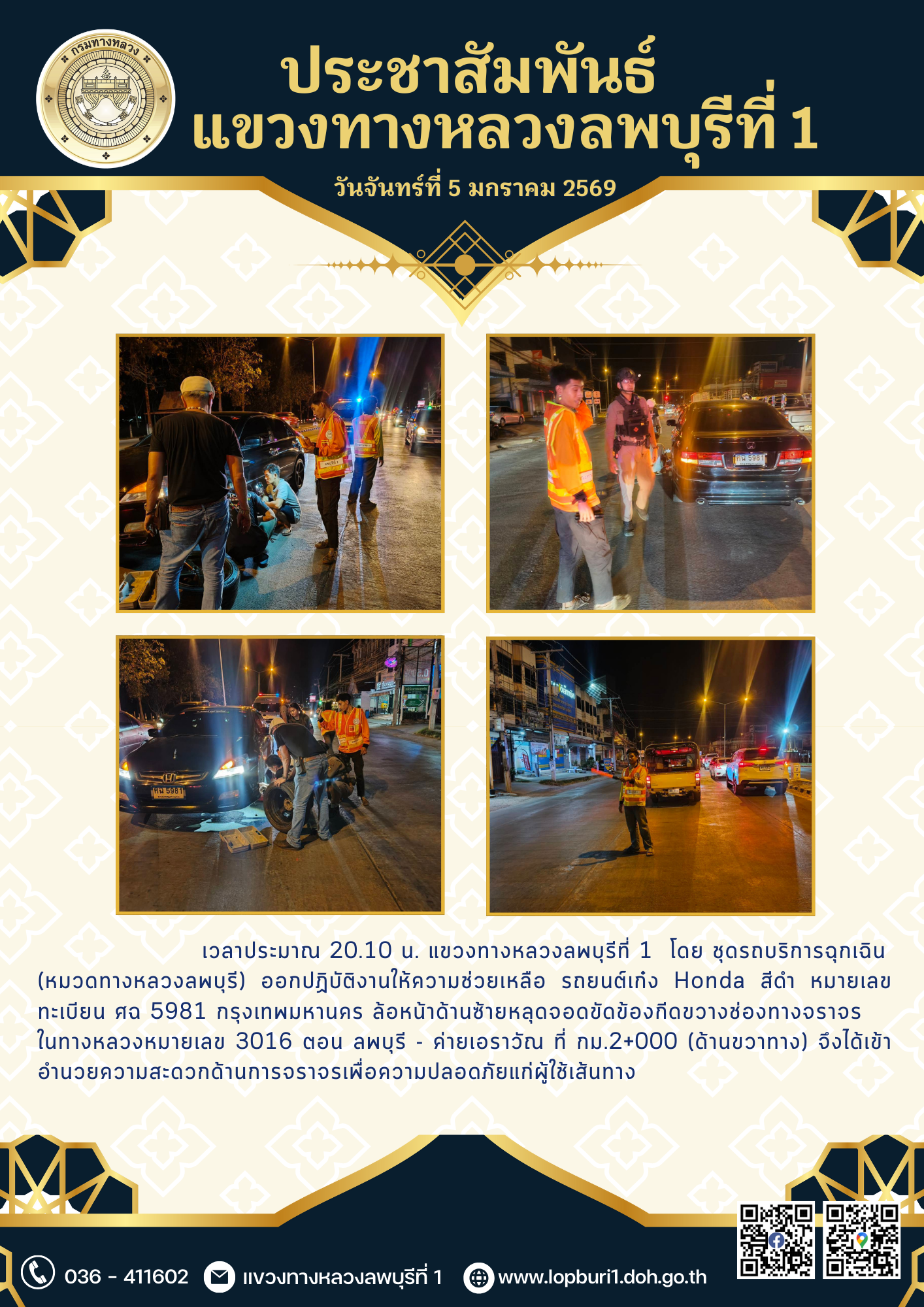 เวลาประมาณ 20.10 น. แขวงทางหลวงลพบุรีที่ 1 โดย ชุดรถบริการฉุกเฉิน (หมวดทางหลวงลพบุรี) ออกปฏิบัติงานให้ความช่วยเหลือ รถยนต์เก๋ง Honda สีดำ หมายเลขทะเบียน ศฉ 5981 กรุงเทพมหานคร ล้อหน้าด้านซ้ายหลุดจอดขัดข้องกีดขวางช่องทางจราจร ในทางหลวงหมายเลข 3016 ตอน ลพบุรี - ค่ายเอราวัณ ที่ กม.2+000 (ด้านขวาทาง) จึงได้เข้าอำนวยความสะดวกด้านการจราจรเพื่อความปลอดภัยแก่ผู้ใช้เส้นทาง