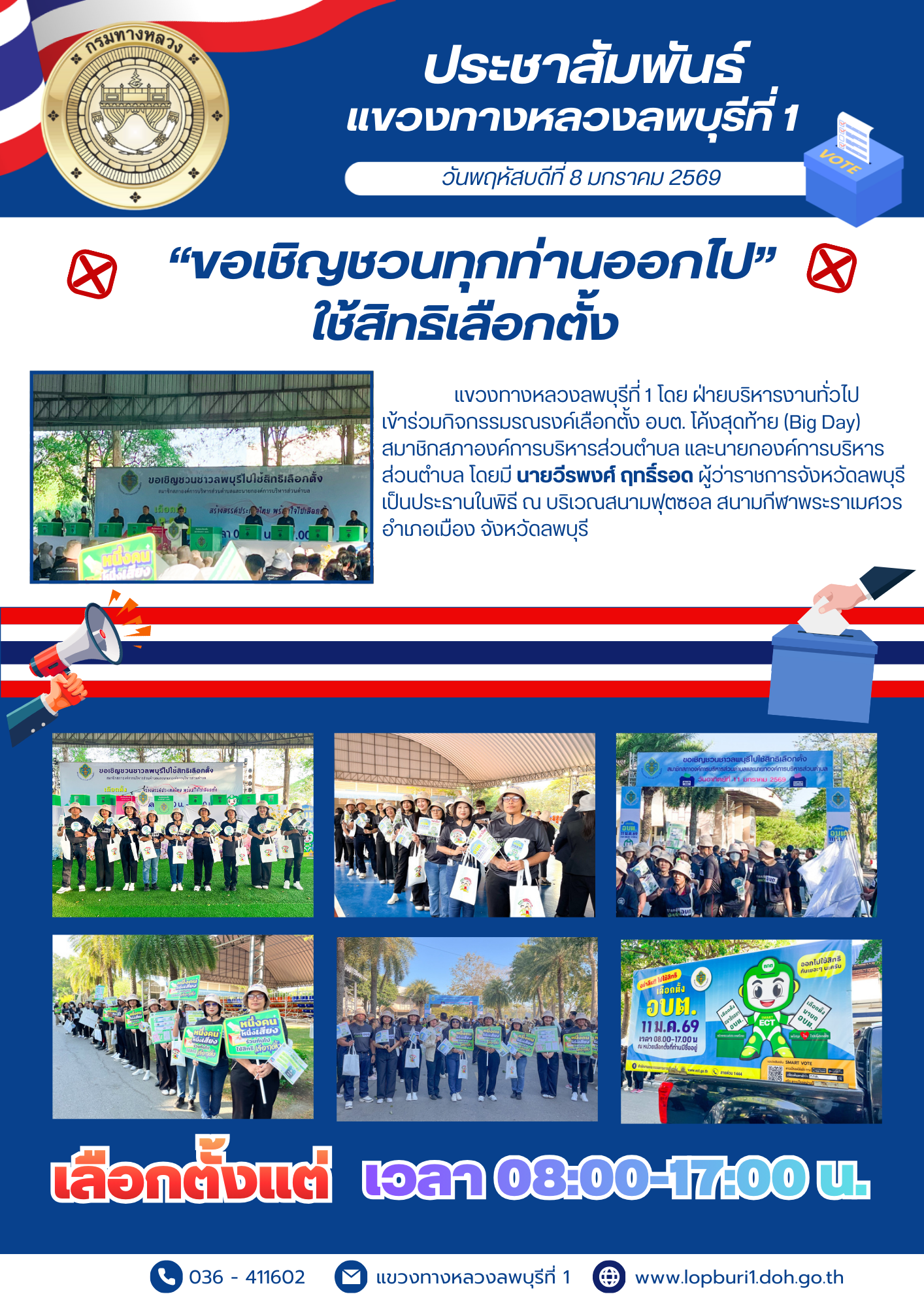 แขวงทางหลวงลพบุรีที่ 1 โดย ฝ่ายบริหารงานทั่วไป เข้าร่วมกิจกรรมรณรงค์เลือกตั้ง อบต. โค้งสุดท้าย (Big Day) สมาชิกสภาองค์การบริหารส่วนตำบล และนายกองค์การบริหารส่วนตำบล โดยมี นายวีรพงศ์ ฤทธิ์รอด ผู้ว่าราชการจังหวัดลพบุรี เป็นประธานในพิธี ณ บริเวณสนามฟุตซอล สนามกีฬาพระราเมศวร อำเภอเมือง จังหวัดลพบุรี