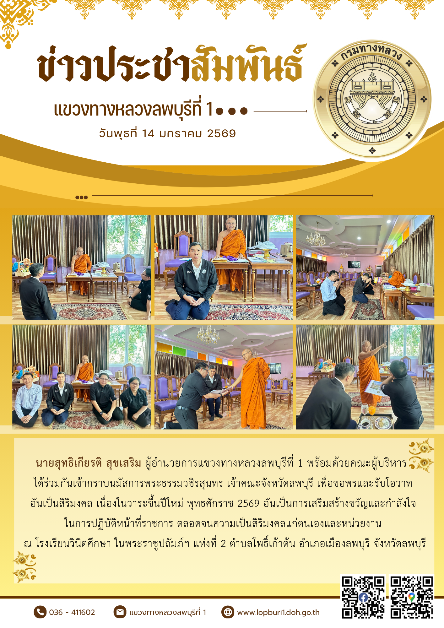 นายสุทธิเกียรติ สุขเสริม ผู้อำนวยการแขวงทางหลวงลพบุรีที่ 1 พร้อมด้วยคณะผู้บริหาร ได้ร่วมกันเข้ากราบนมัสการพระธรรมวชิรสุนทร เจ้าคณะจังหวัดลพบุรี เพื่อขอพรและรับโอวาท อันเป็นสิริมงคล เนื่องในวาระขึ้นปีใหม่ พุทธศักราช 2569