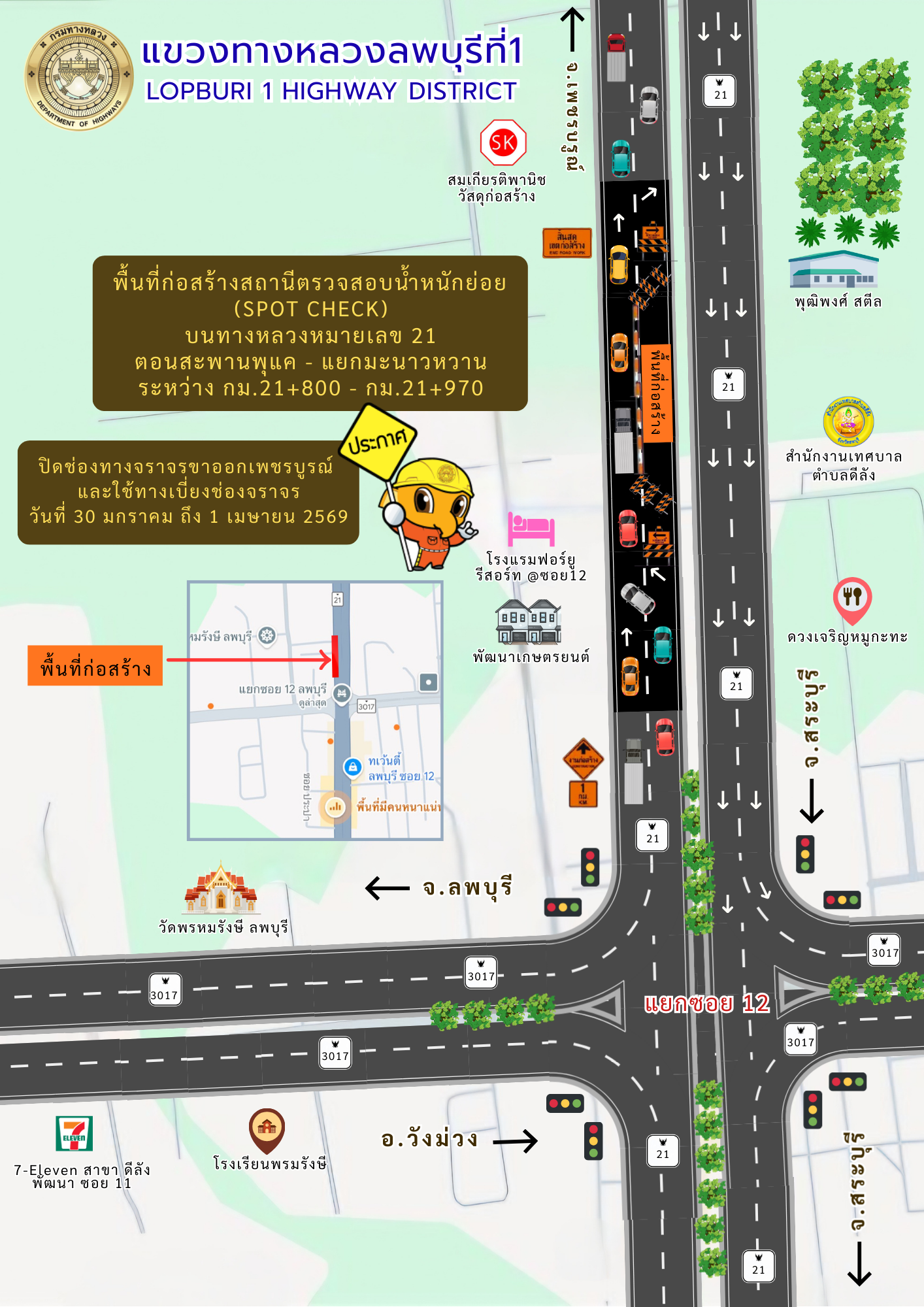 แขวงทางหลวงลพบุรีที่ 1 ขอประชาสัมพันธ์ ปิดการจราจร ช่วงก่อสร้างเป็นการชั่วคราว ?????? ?? เพื่อดำเนินการก่อสร้างสถานีตรวจสอบน้ำหนักย่อย (SPOT CHECK) ??ทางหลวงหมายเลข 21