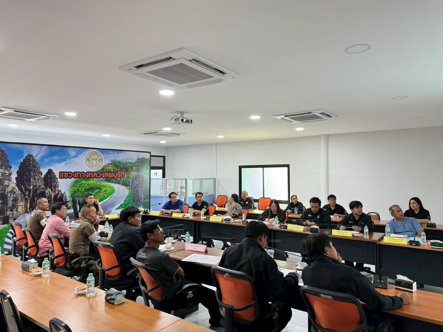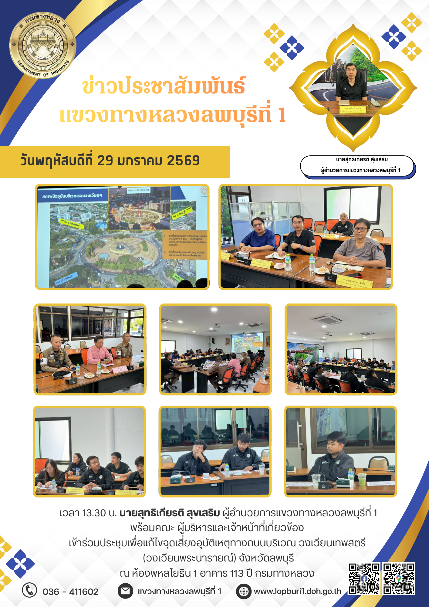 เวลา 13.30 น. นายสุทธิเกียรติ สุขเสริม ผู้อำนวยการแขวงทางหลวงลพบุรีที่ 1 พร้อมคณะ ผู้บริหารและเจ้าหน้าที่เกี่ยวข้อง เข้าร่วมประชุมเพื่อแก้ไขจุดเสี่ยงอุบัติเหตุทางถนนบริเวณ วงเวียนเทพสตรี (วงเวียนพระนารายณ์) จังหวัดลพบุรี ณ ห้องพหลโยธิน 1 อาคาร 113 ปี กรมทางหลวง