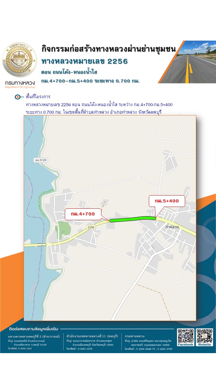 ประชาสัมพันธ์เชิญเข้าร่วมประชุมรับฟังความคิดเห็นของประชาชนโครงการก่อสร้างโครงข่ายทางหลวงแผ่นดิน กิจกรรมก่อสร้างทางหลวงผ่านชุมชนเพื่อคนทุกกลุ่ม งานพัฒนาทางหลวงผ่านย่านชุมชน ทางหลวงหมายเลข 2256 ตอน ถนนโค้ง – หนองน้ำใส ระหว่าง กม.4+700 – กม.5+400 ระยะทาง 0.700 กิโลเมตร
