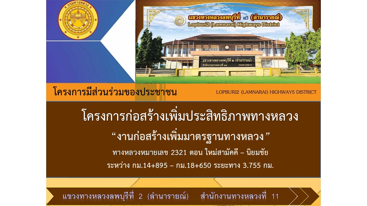 สรุปผลการดำเนินงานการมีส่วนร่วมของประชาชนโครงการก่อสร้างโครงข่ายทางหลวงแผ่นดิน “กิจกรรมก่อสร้างเพิ่มประสิทธิทางหลวง” ทางหลวงหมายเลข 2321 ตอนควบคุม 0100 ตอน ใหม่สามัคคี - นิยมชัย ระหว่าง กม.14+895 – กม.18+650 ระยะทางดำเนินการ 3.755 กม. อยู่ในพื้นที่ตำบลนิยมชัย อำเภอสระโบสถ์ จังหวัดลพบุรี