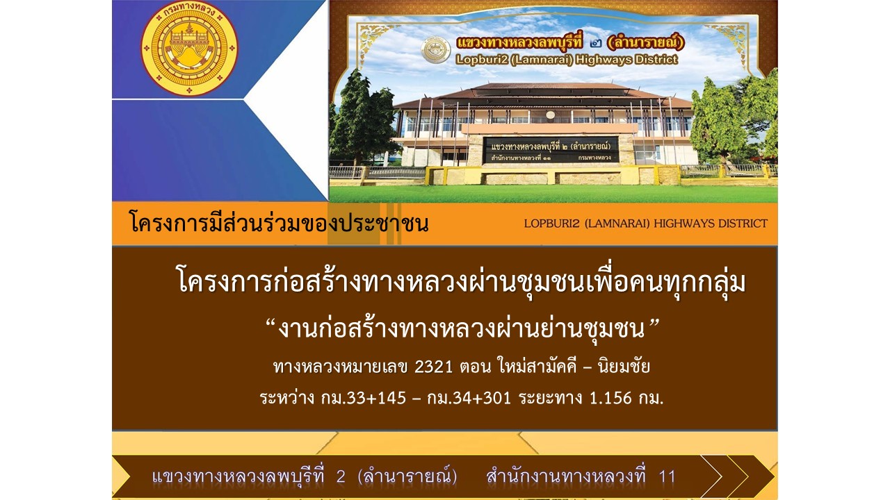 สรุปผลการดำเนินงานการมีส่วนร่วมของประชาชน โครงการก่อสร้างทางหลวงผ่านย่านชุมชน“กิจกรรมก่อสร้างทางหลวงผ่านย่านชุมชน”ทางหลวงหมายเลข 2321 ตอนควบคุม 0100 ตอน ใหม่สามัคคี – นิยมชัย ระหว่าง กม.33+145 – กม.34+301 ระยะทาง 1.156 กม. อยู่ในพื้นที่ตำบลนิยมชัย อำเภอสระโบสถ์ จังหวัดลพบุรี