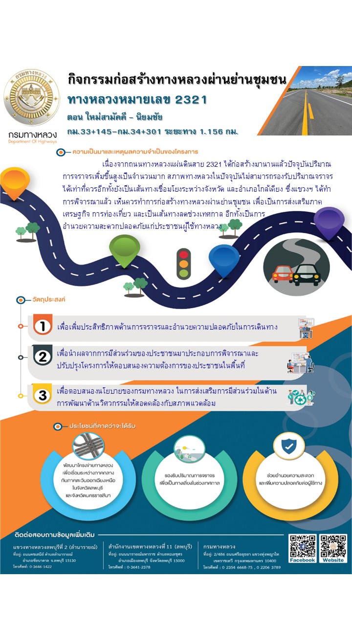 ประชาสัมพันธ์เชิญเข้าร่วมประชุมรับฟังความคิดเห็นของประชาชนโครงการก่อสร้างโครงข่ายทางหลวงแผ่นดิน กิจกรรมก่อสร้างทางหลวงผ่านชุมชนเพื่อคนทุกกลุ่ม งานพัฒนาทางหลวงผ่านย่านชุมชน ทางหลวงหมายเลข 2321 ตอน ใหม่สามัคคี – นิยมชัย ระหว่าง กม.33+145 – กม.34+301 ระยะทาง 1.156 กิโลเมตร