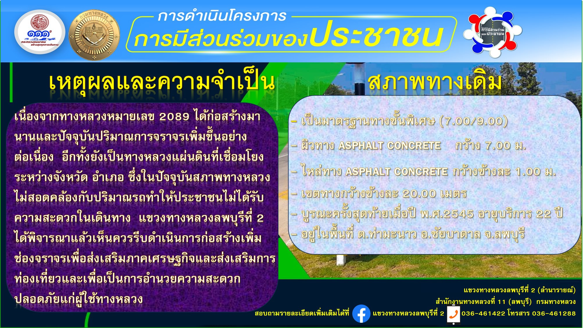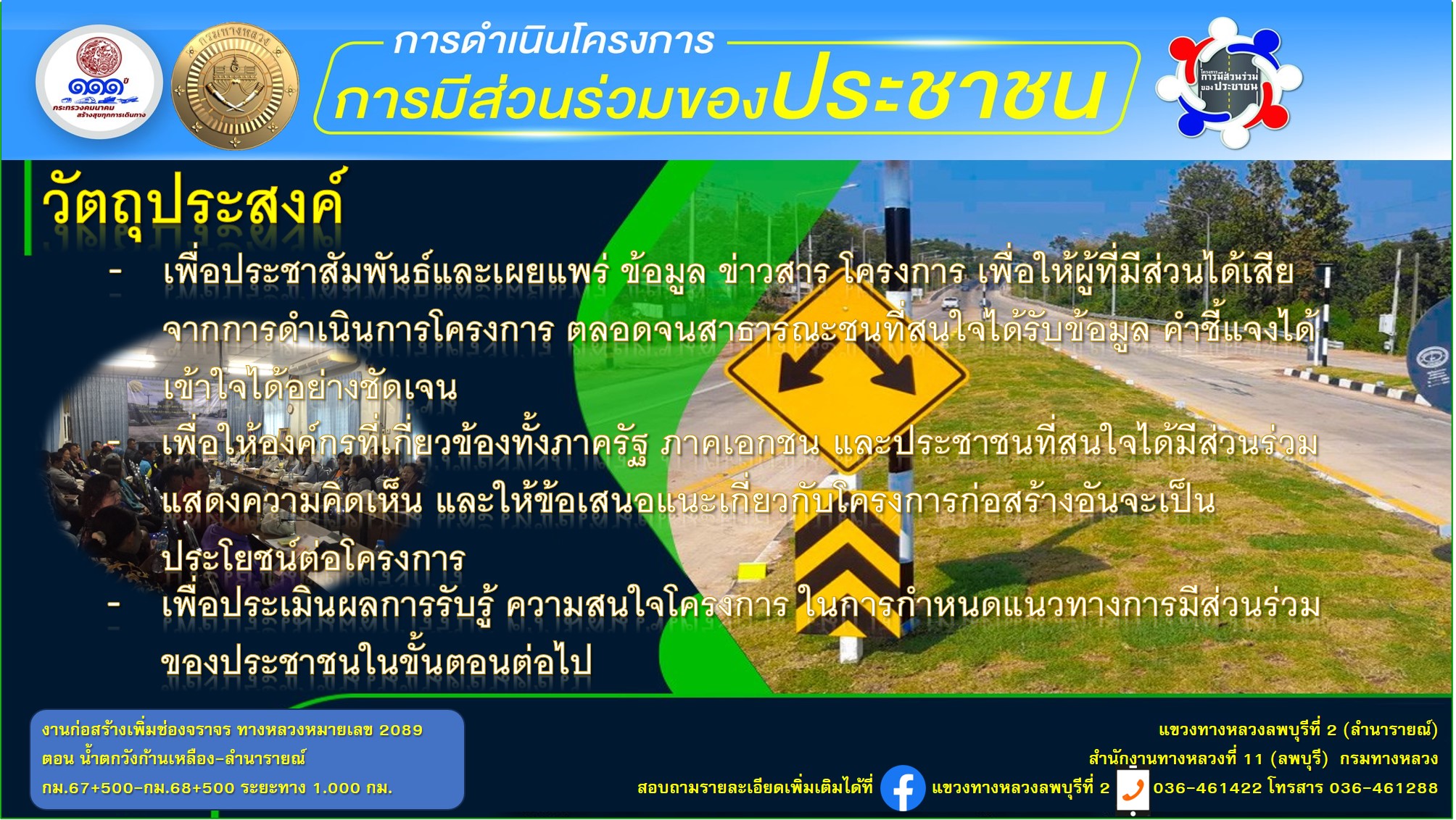 แขวงทางหลวงลพบุรีที่ 2 (ลำนารายณ์) กรมทางหลวง จึงเรียนเชิญผู้ที่สนใจ เข้าร่วมประชุมรับฟังการบรรยายพร้อมแสดงความคิดเห็น และร่วมแลกเปลี่ยนนข้อมูลข่าวสารต่าง ในวันอังคารที่ 12 มีนาคม 2567 เวลา 09.00 น - 12.00 น. ณ ห้องประชุมองค์การบริหารส่วนตำบลท่ามะนาว ตำบลท่ามะนาว อำเภอชัยบาดาล จังหวัดลพบุรี