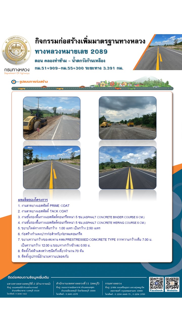ด้วยแขวงทางหลวงลพบุรีที่ 2 (ลำนารายณ์) กรมทางหลวง ได้รับจัดสรรงบประมาณปี 2568 กิจกรรมก่อสร้างเพิ่มมาตรฐานทางหลวง ทางหลวงหมายเลข 2089 ตอน คลองท่าข้าม - น้ำตกวังก้านเหลือง ระหว่าง กม.51+900 - กม.55+300 ระยะทาง 3.391 กม. โดยจะทำการปรับปรุงผิวทางและไหล่ทางจากมาตรฐานทางชั้น 7/(9) เป็นมาตรฐานทาง 7/(12) ซึ่งจะดำเนินการปรับปรุงผิวจราจรและขยายไหล่ทางจากความกว้างเดิม 1.00 ม.เป็นความกว้าง 2.50 ม. พร้อมติดตั้งอุปกรณ์อำนวยความปลอดภัย เพื่อเพิ่มประสิทธิภาพในการรองรับประมาณจราจรที่เพิ่มมากขึ้น และเพื่ออำนวยความสะดวกปลอดภัยแก่ผู้ใช้ทางหลวง
