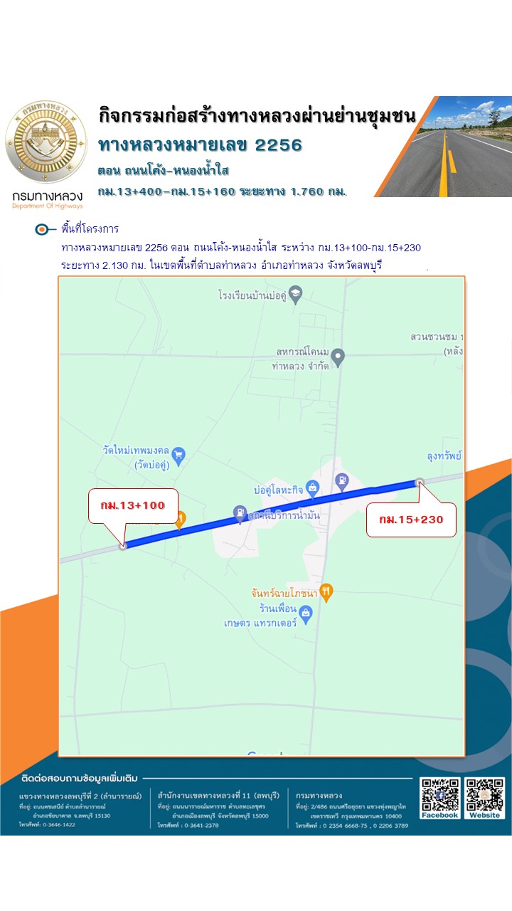 ด้วยแขวงทางหลวงลพบุรีที่ 2 (ลำนารายณ์) กรมทางหลวง ได้รับจัดสรรงบประมาณปี 2568 โครงการก่อสร้างโครงข่ายทางหลวงแผ่นดิน กิจกรรมก่อสร้างทางหลวงผ่านชุมชนเพื่อคนทุกกลุ่ม งานพัฒนาทางหลวงผ่านย่านชุมชน ทางหลวงหมายเลข 2256 ตอน ถนนโค้ง – หนองน้ำใส ระหว่าง กม.13+400 - กม.15+160 ระยะทาง 1.760 กม. เพื่อรองรับปริมาณจราจรที่เพิ่มสูงขึ้น จึงทำการก่อสร้างทางหลวงผ่านย่านชุมชนเป็นการขยายช่องจราจร จาก 2 ช่องจราจร เป็น 4 ช่องจราจร ที่มีมารตฐานสูงขึ้นพร้อมติดตั้งอุปกรณ์อำนวยความปลอดภัย