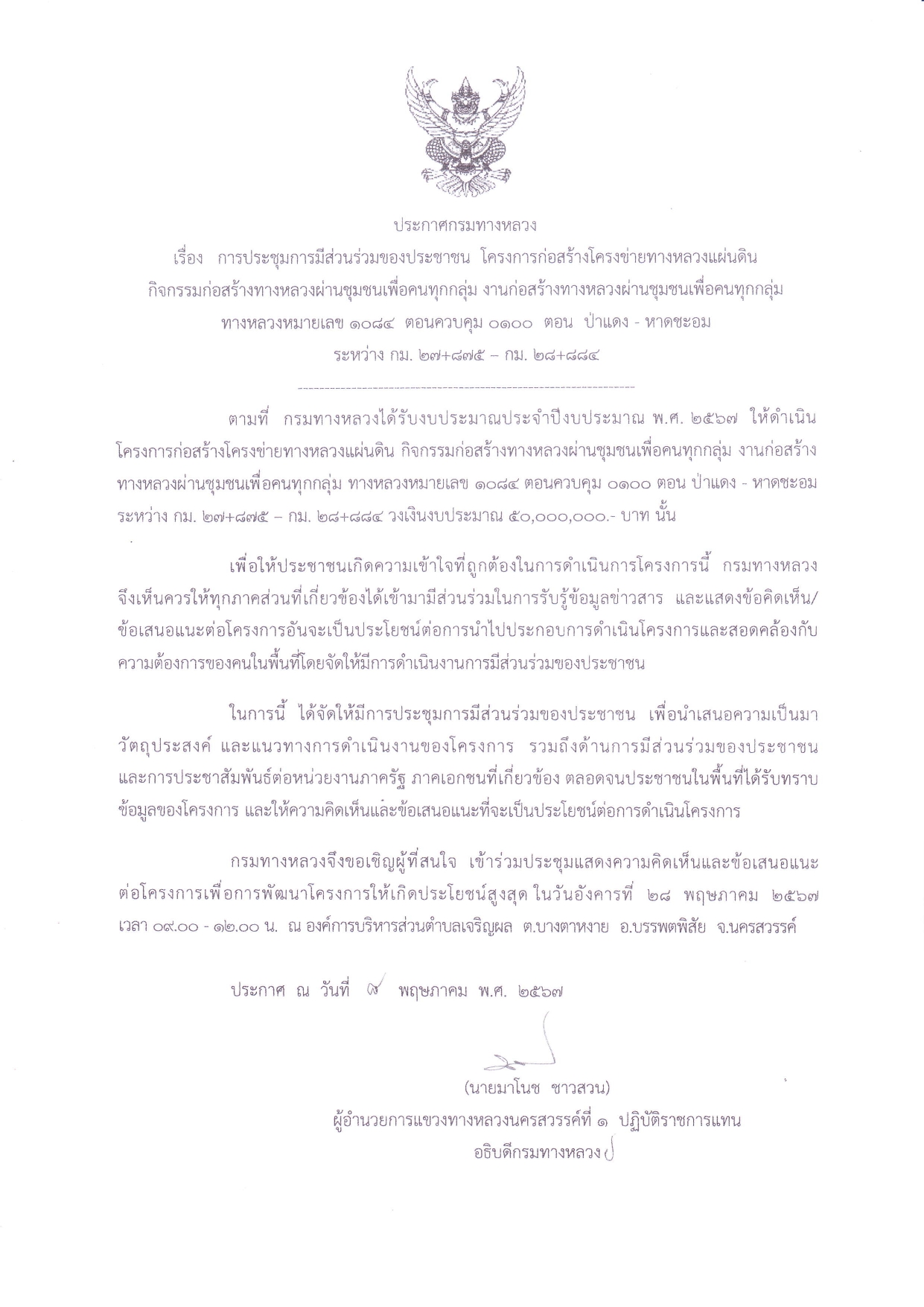 การประชุมการมีส่วนร่วมของประชาชน โครงการก่อสร้างโครงข่ายทางหลวงแผ่นดิน กิจกรรมก่อสร้างทางหลวงผ่านชุมชนเพื่อคนทุกกลุ่ม งานก่อสร้างทางหลวงผ่านชุมชุนเพื่อคนทุกกลุ่ม ทางหลวงหมายเลข 1084 ตอนควบคุม 0100 ตอน ป่าแดง - หาดชะอม ระหว่าง กม. 27+875 - กม. 28+884