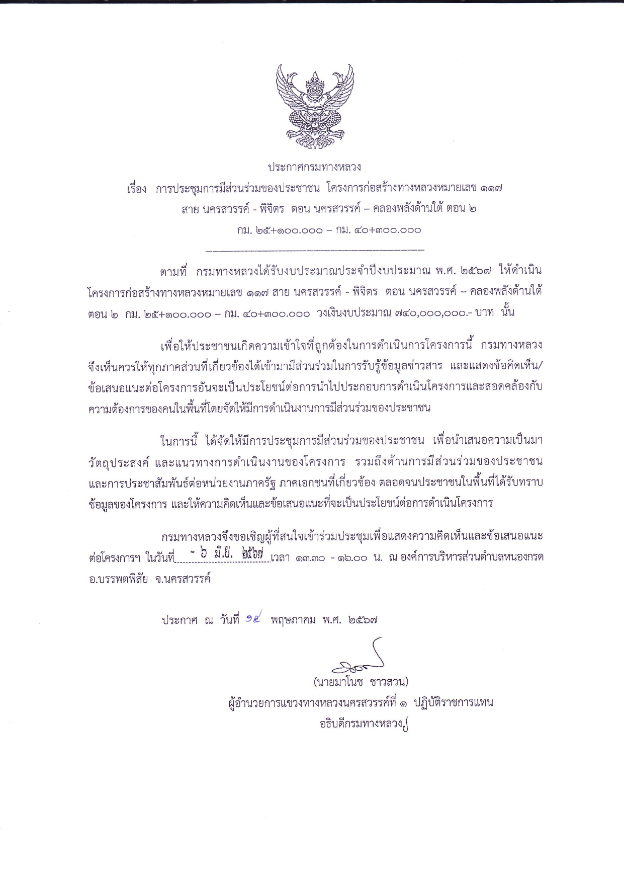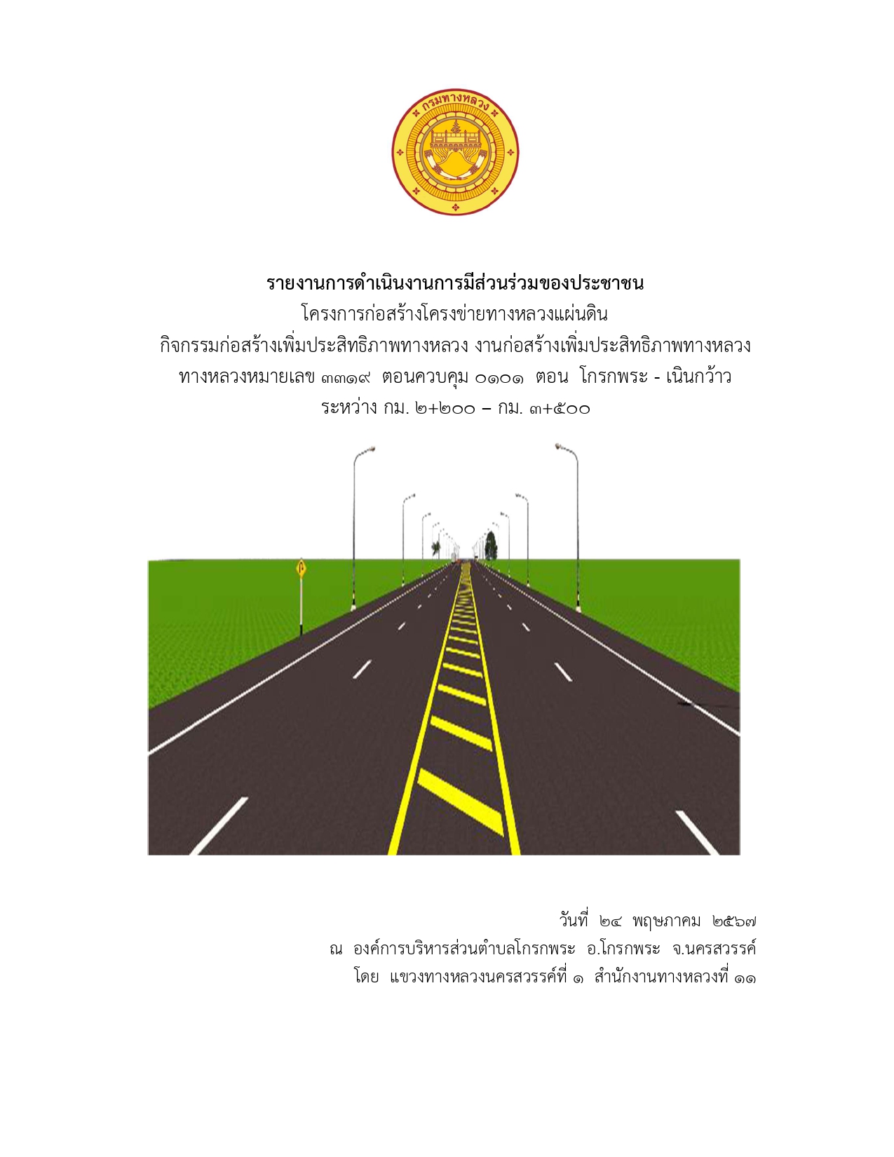 การประชุมการมีส่วนร่วมของประชาชน โครงการก่อสร้างทางหลวงหมายเลข 117 สาย นครสวรรค์ – พิจิตร ตอน นครสวรรค์ – คลองพลังด้านใต้ ตอน 2 ระหว่าง กม. 25+100 – กม. 40+300